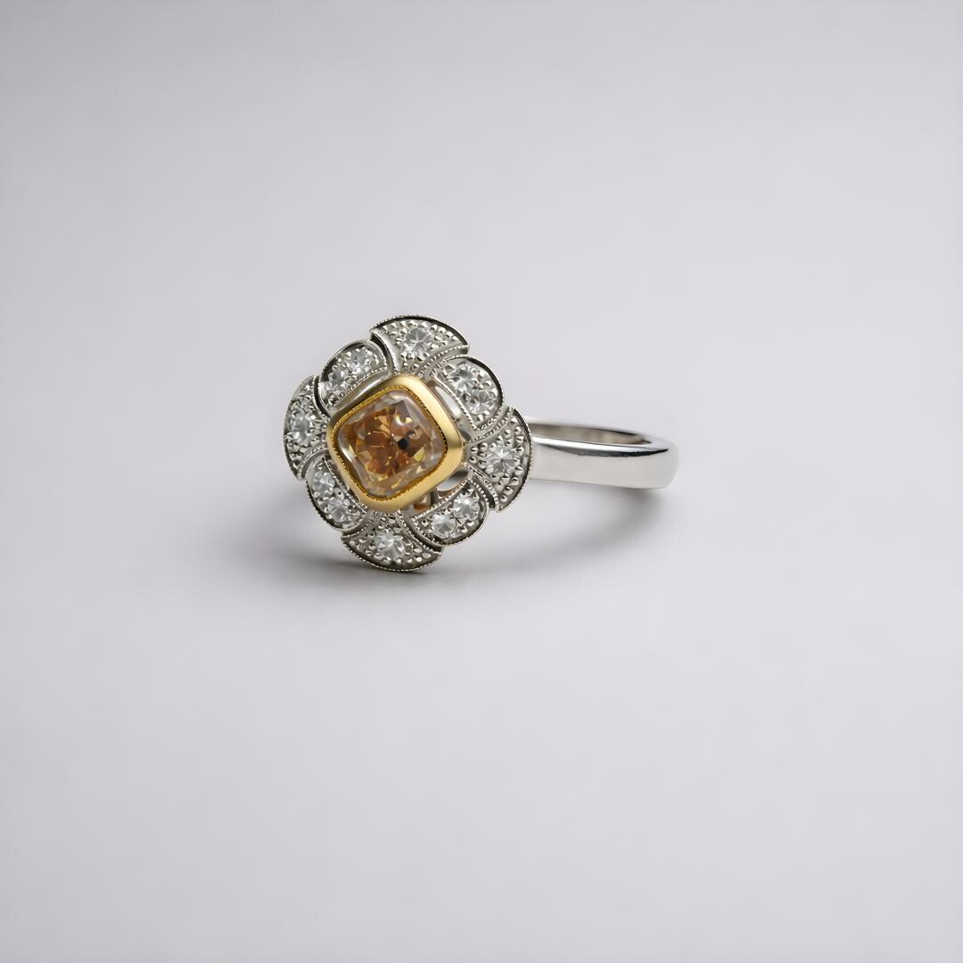 Autour de la pierre centrale, un motif travaillé façon rosace/éventail, entièrement rehaussé de diamants totalisant 0,170 ct, apporte relief, brillance et une élégance très joaillière. Les finitions délicates (effet milgrain et volumes sculptés) renforcent l’allure vintage-chic tout en conservant une présence résolument moderne.