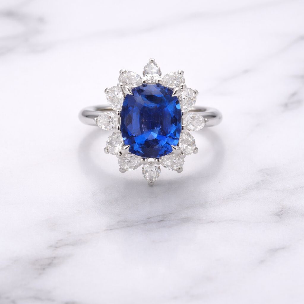 Spectaculaire et parfaitement équilibrée, cette bague en or blanc met en scène un saphir bleu taille coussin, à la couleur profonde et vibrante. La pierre centrale est magnifiée par un entourage de diamants disposés comme des pétales, créant une véritable fleur de lumière autour du saphir. Ce jeu de volumes et de tailles apporte un éclat exceptionnel, tout en conservant une élégance intemporelle.