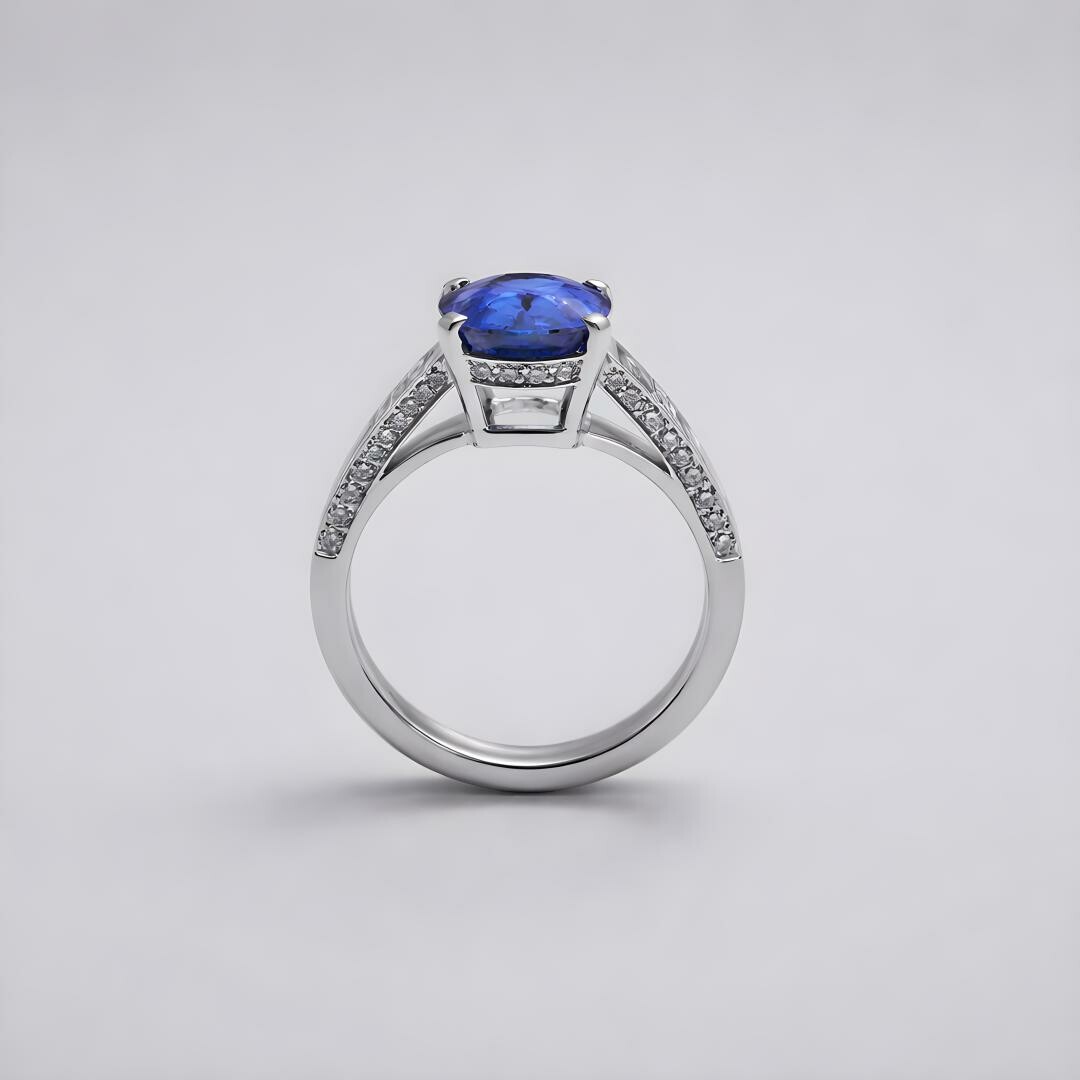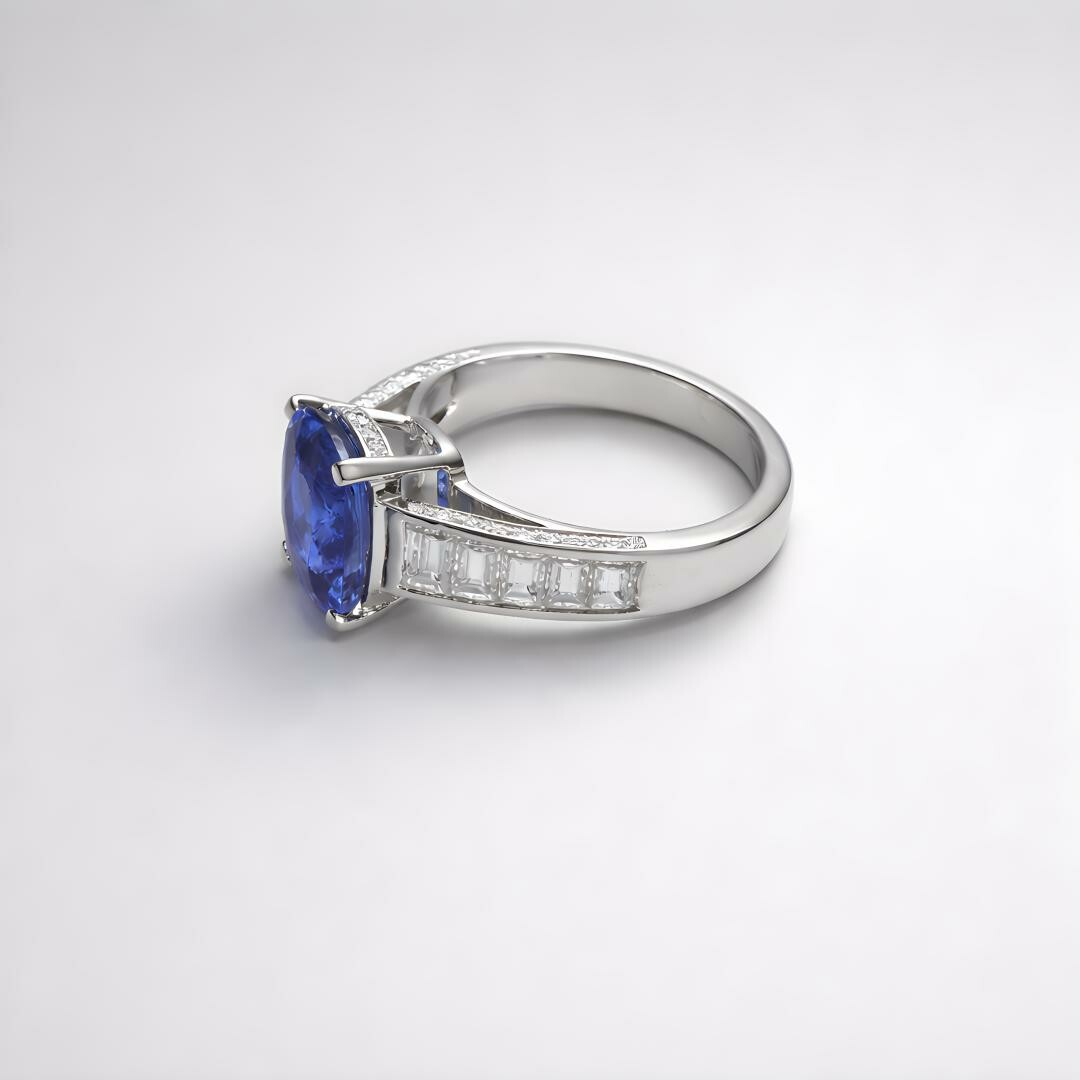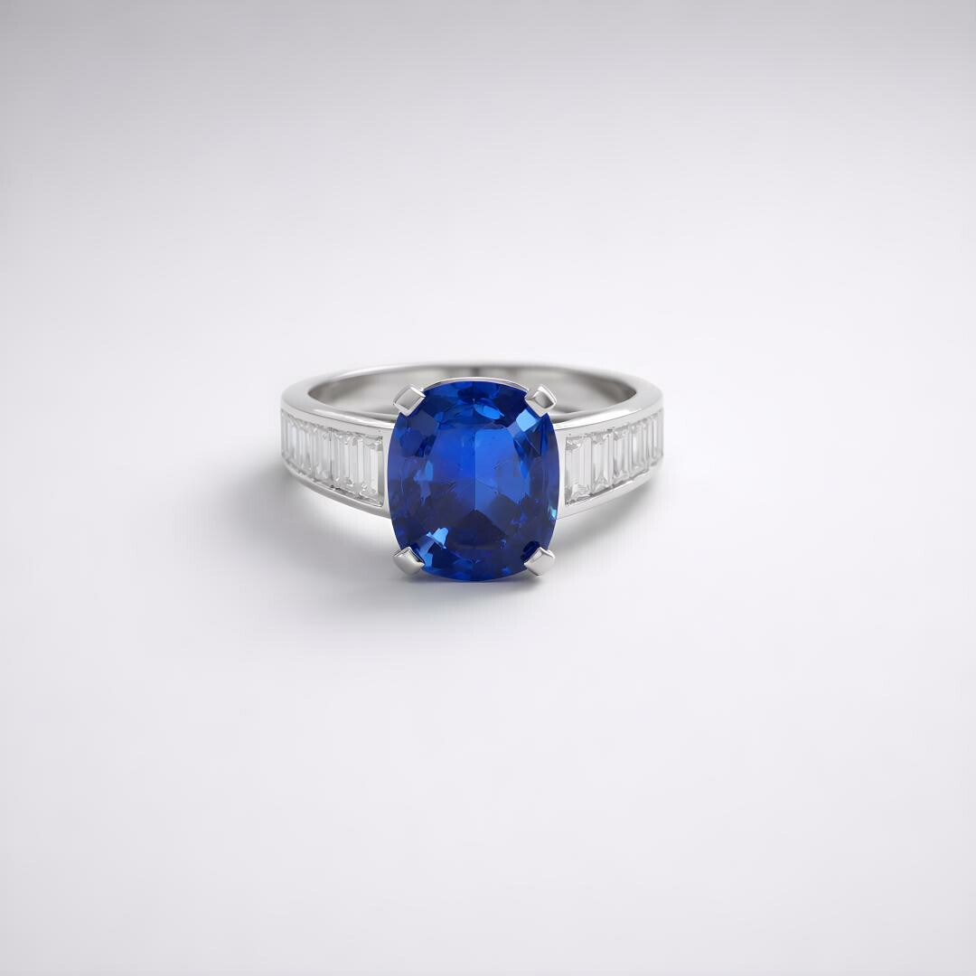Graphique, structurée, absolument éclatante : cette bague en or blanc met en scène un saphir bleu taille coussin, au bleu profond et vibrant, serti griffes pour maximiser la lumière. Une ligne de diamants taille baguette apporte une signature résolument architecturale, tandis que des diamants taille brillant viennent compléter l’ensemble avec une brillance plus douce, plus scintillante.