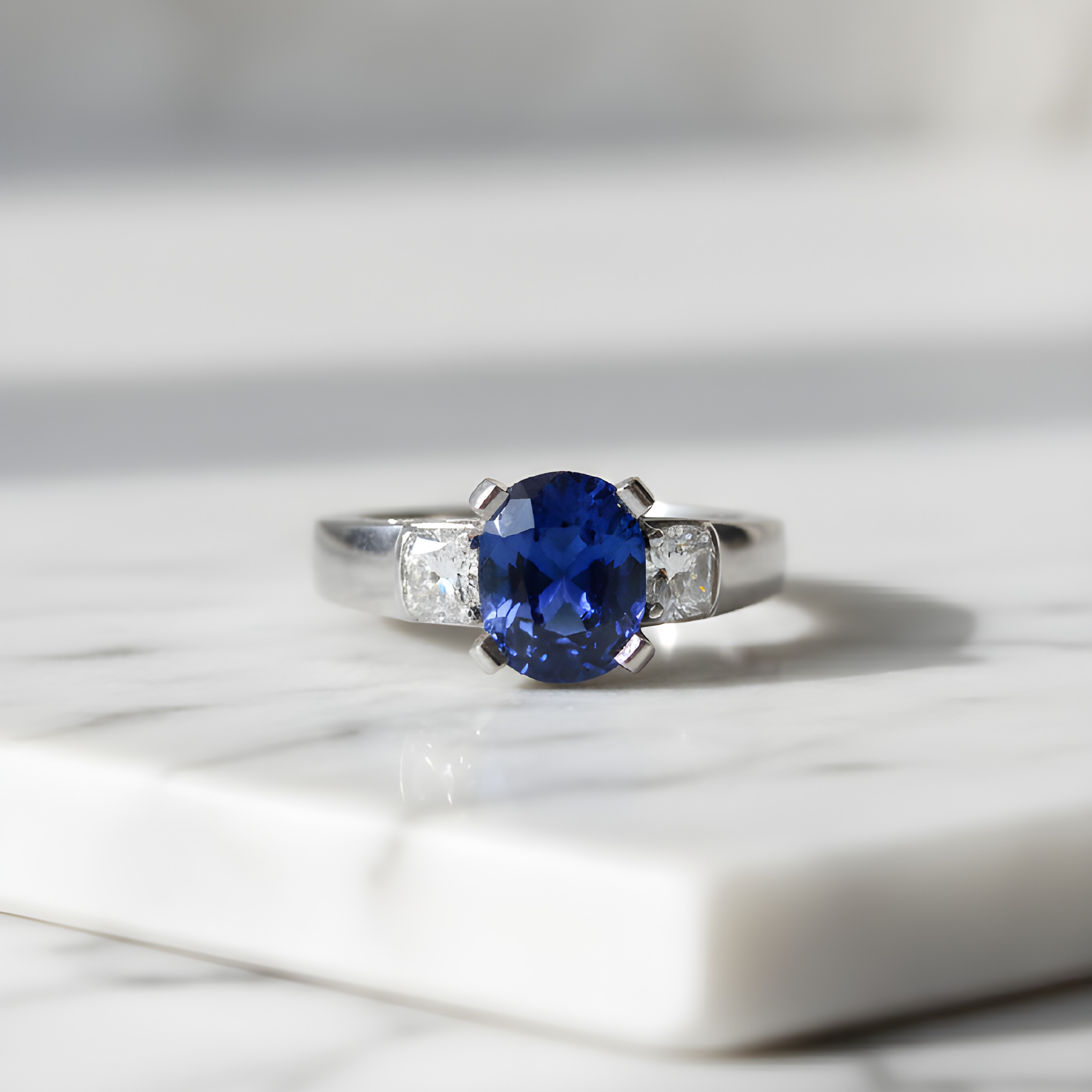 Cette bague en or blanc met à l’honneur un superbe saphir de Ceylan au bleu profond, taille ovale, maintenu par un sertissage griffes qui laisse la pierre capter la lumière sous tous les angles. De part et d’autre, deux diamants taille princesse viennent équilibrer la composition et accentuer la présence du saphir, tout en apportant une brillance nette, élégante, sans surcharge.
