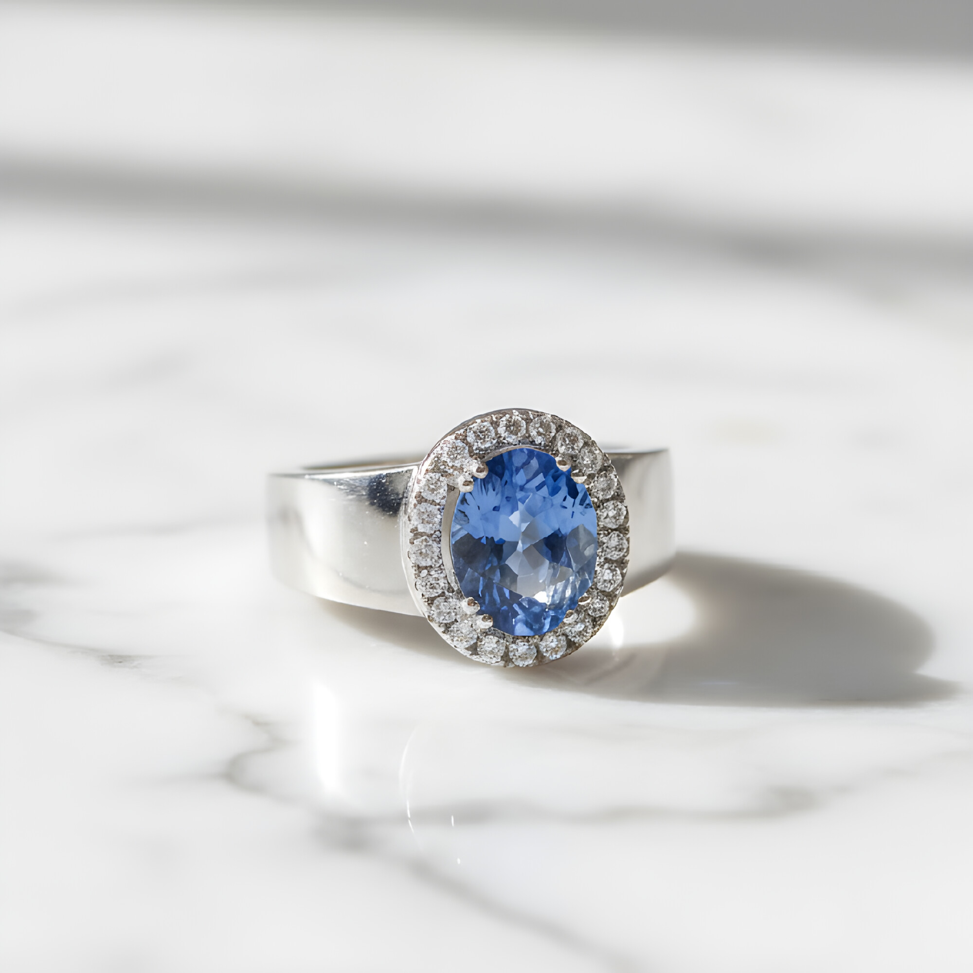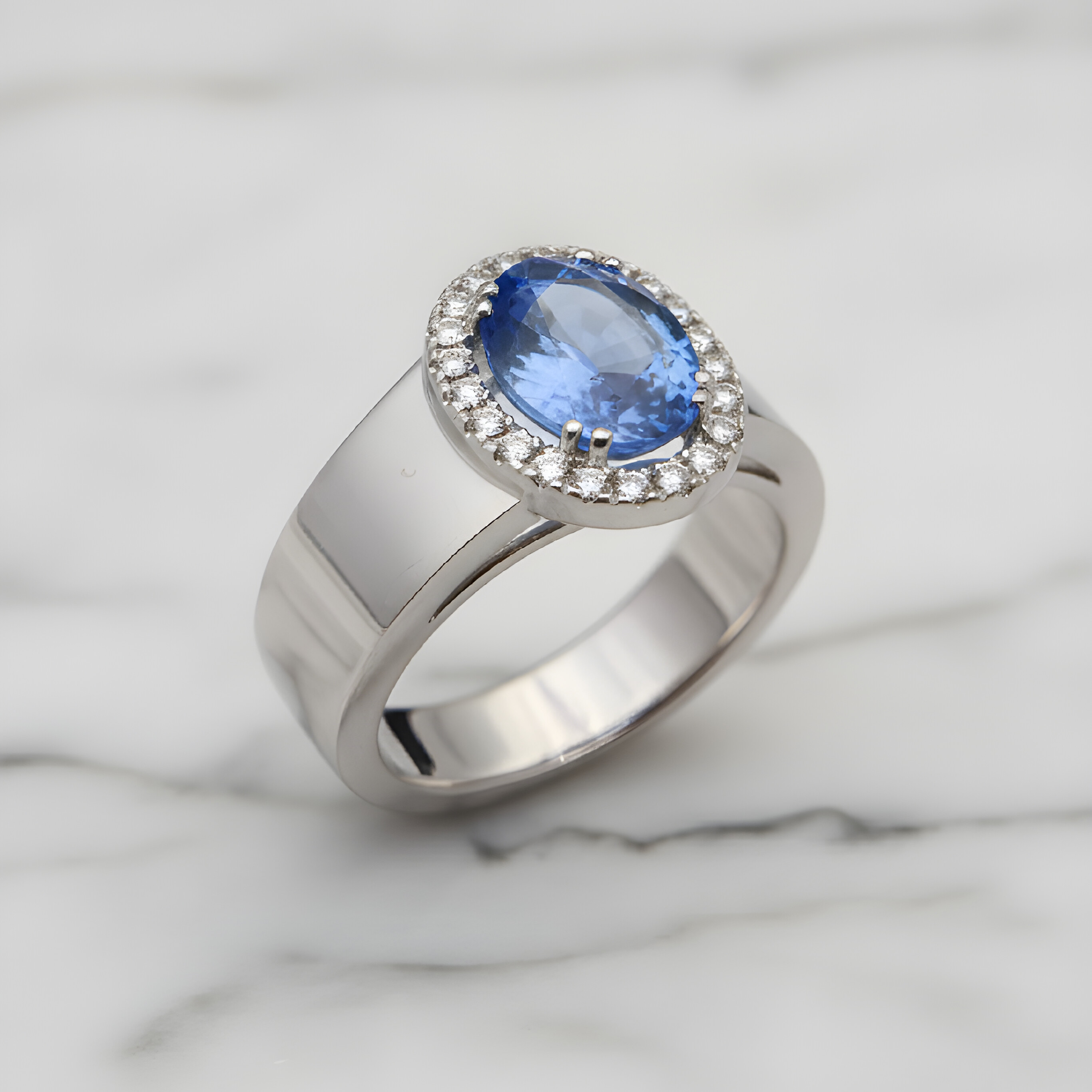 Iconique et profondément élégante, cette bague en or blanc met en scène un saphir bleu taille ovale, à l’éclat intense et hypnotique. La pierre centrale est magnifiée par un entourage de diamants taille brillant, formant une couronne lumineuse qui amplifie chaque reflet et donne immédiatement du relief à la bague.