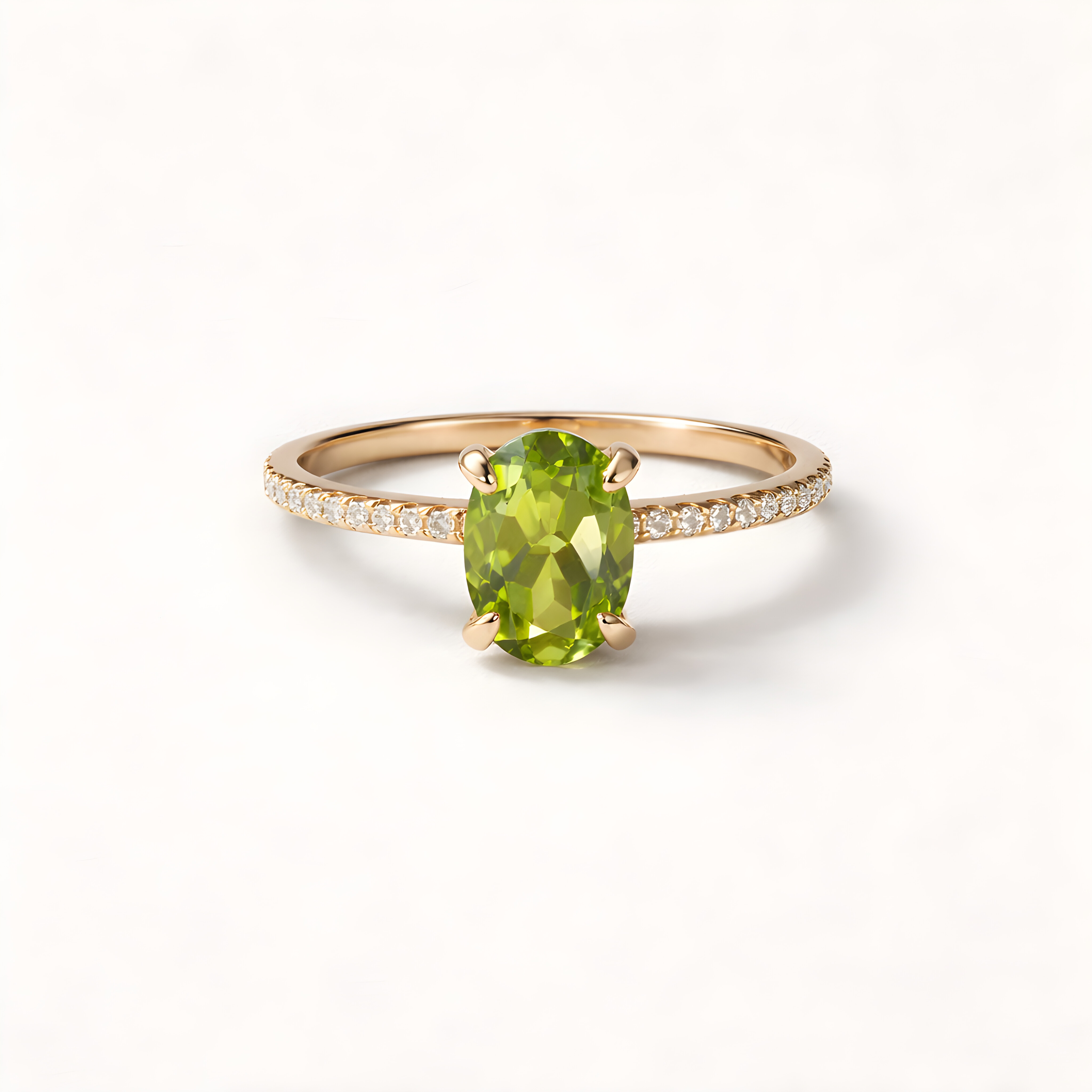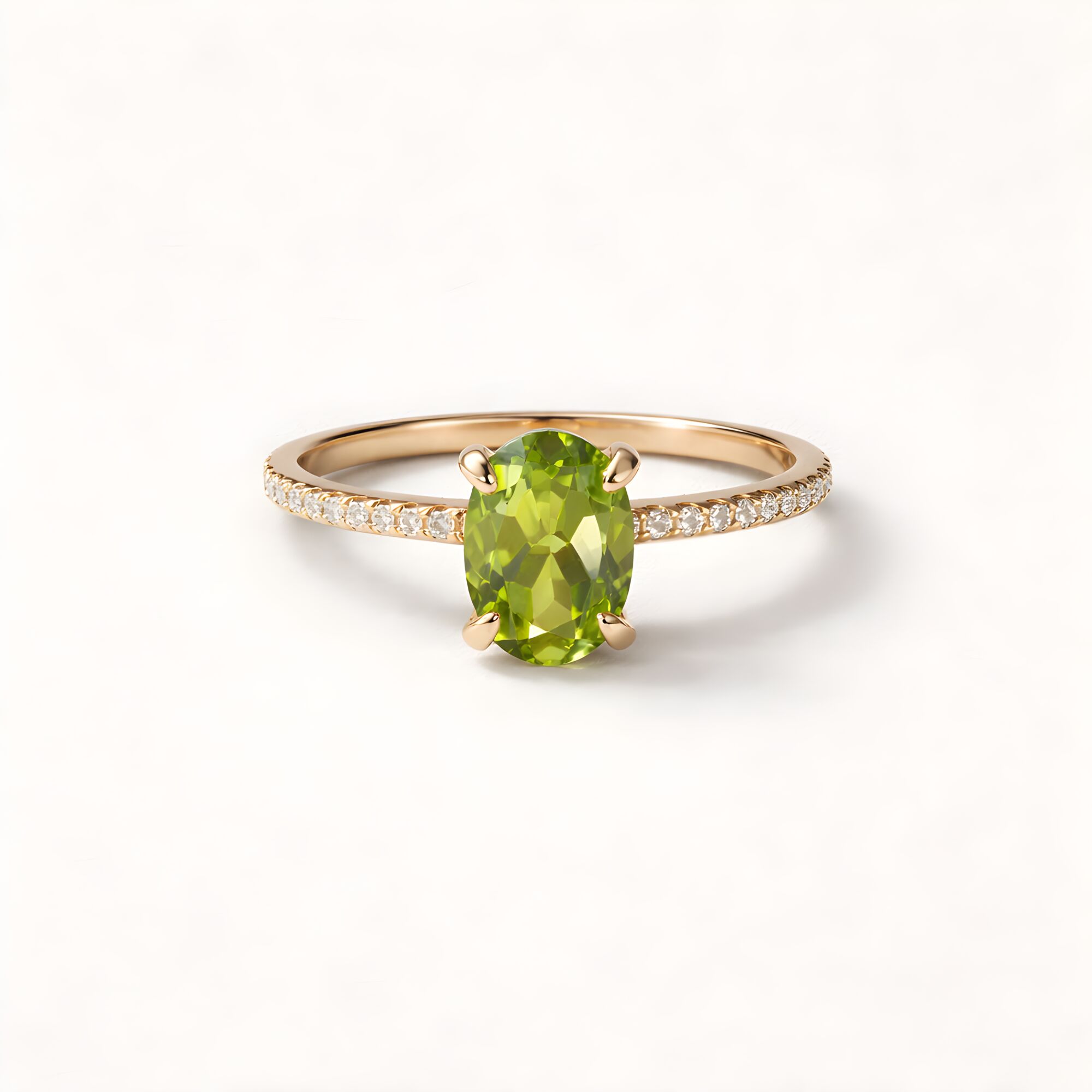 Solaire et délicatement précieuse, cette bague en or jaune illumine la main grâce à un superbe péridot taille ovale, au vert frais et vibrant. Son sertissage griffes met la pierre en pleine lumière, révélant ses reflets citronnés et sa transparence lumineuse.