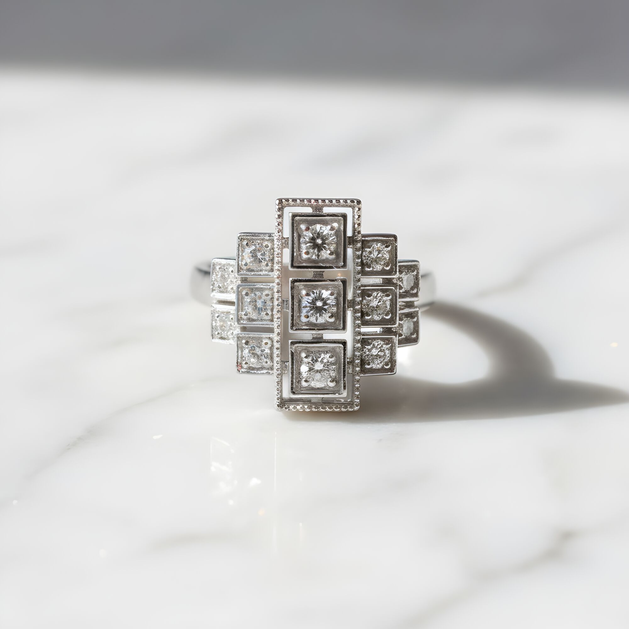 Cette bague en or blanc séduit par son design graphique et contemporain. Les diamants délicatement sertis sont disposés en motifs géométriques, créant un jeu de lumière élégant et structuré. Chaque détail est pensé pour offrir éclat, relief et modernité, tout en conservant une allure intemporelle.