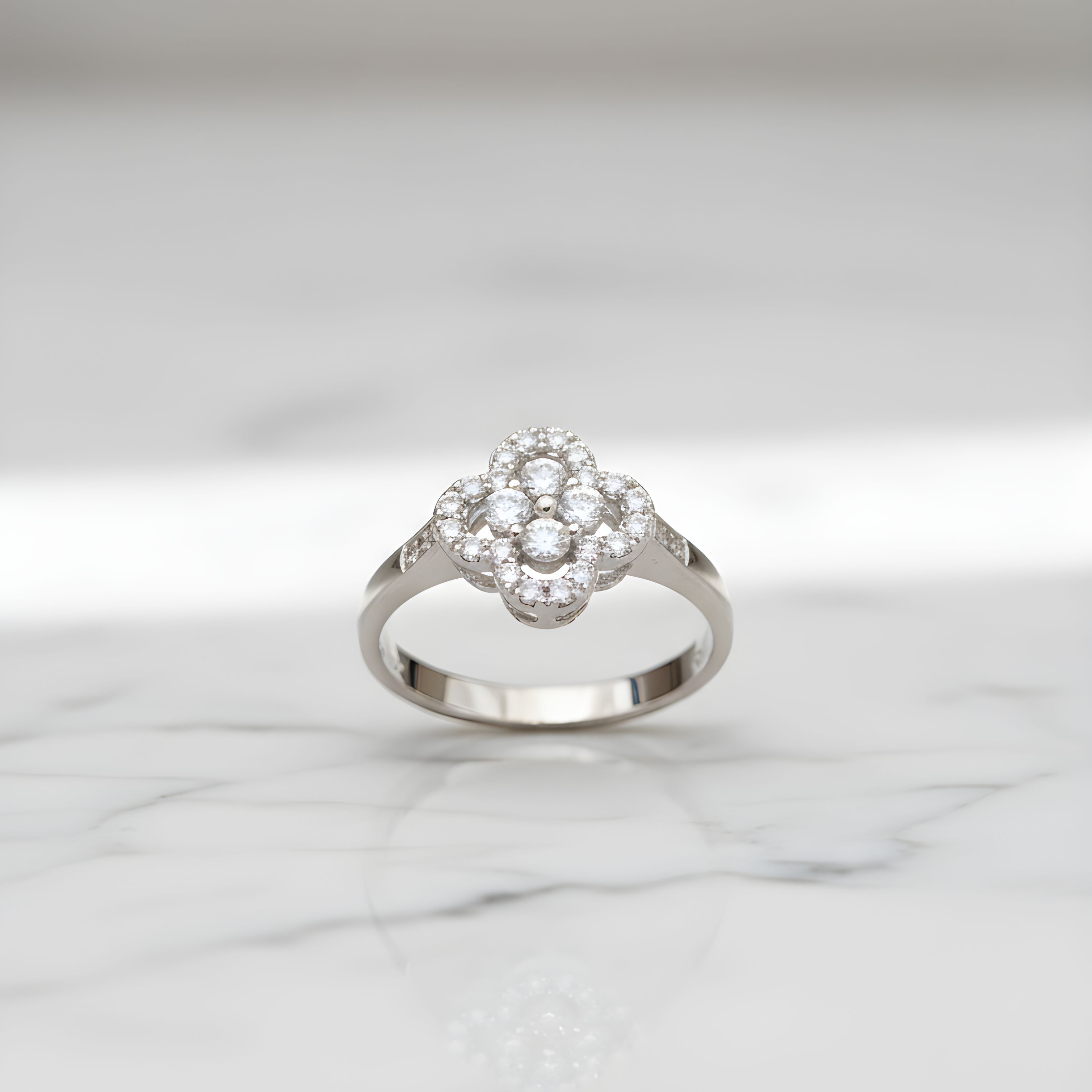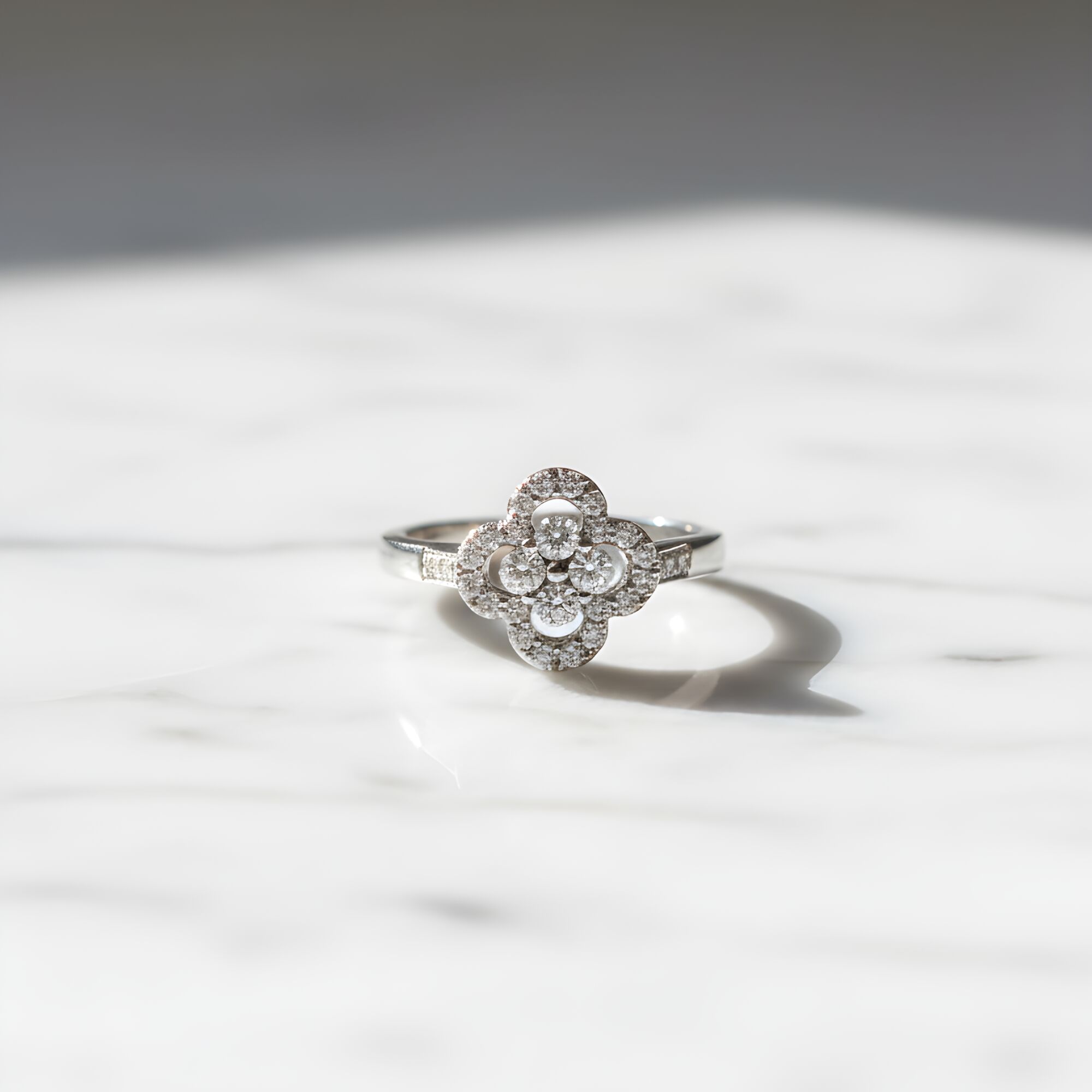 Cette bague en or blanc séduit par son élégant motif trèfle, symbole de chance et de raffinement. Le centre est délicatement composé de diamants taille brillant, subtilement sertis pour créer un jeu de lumière harmonieux et sophistiqué. L’équilibre parfait entre la douceur des courbes et l’éclat des pierres confère à cette bague une allure à la fois moderne et intemporelle.