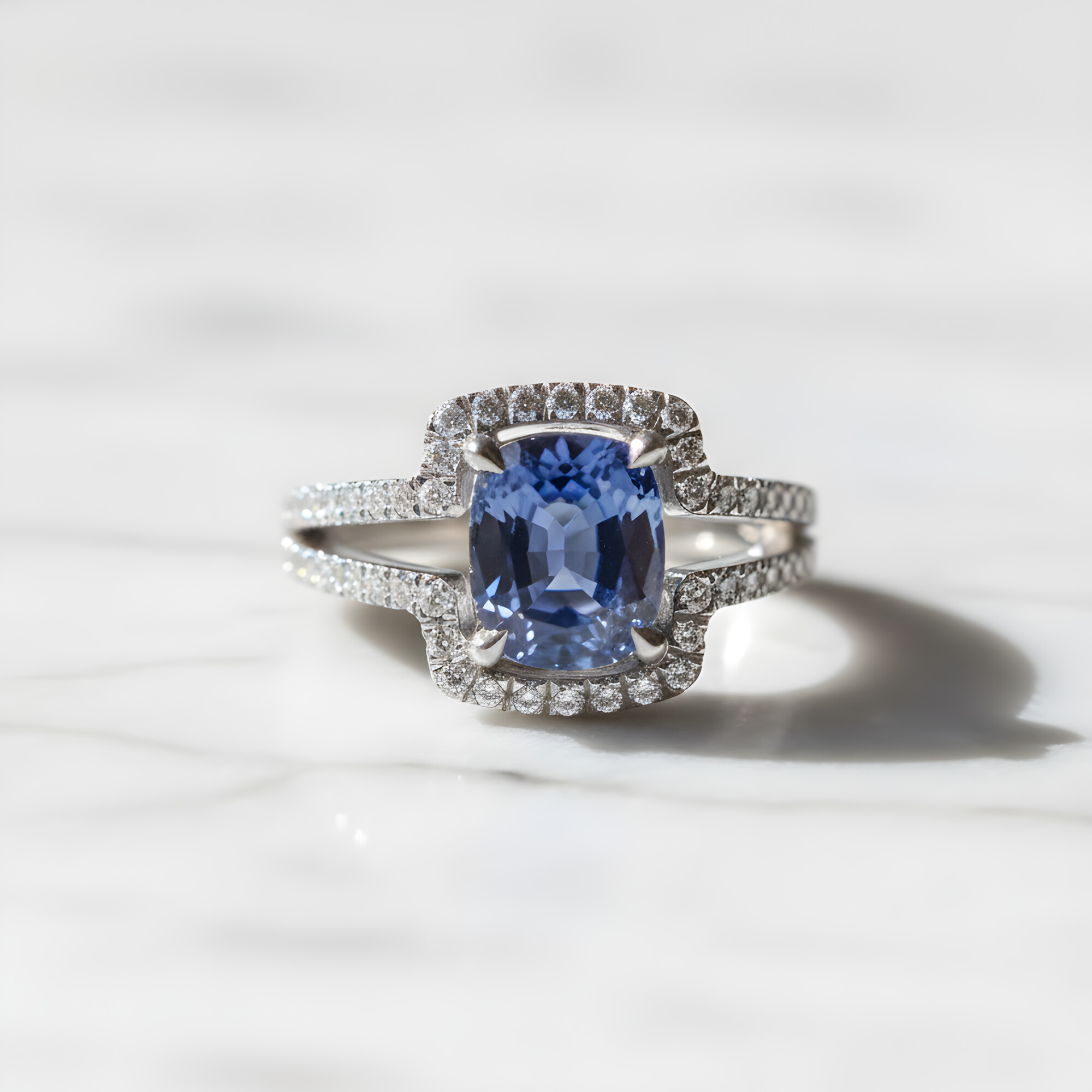 Le saphir est sublimé par un entourage et un corps de bague sertis de diamants, apportant éclat, relief et raffinement à l’ensemble. La monture travaillée souligne la pierre centrale tout en offrant une allure élégante et contemporaine.