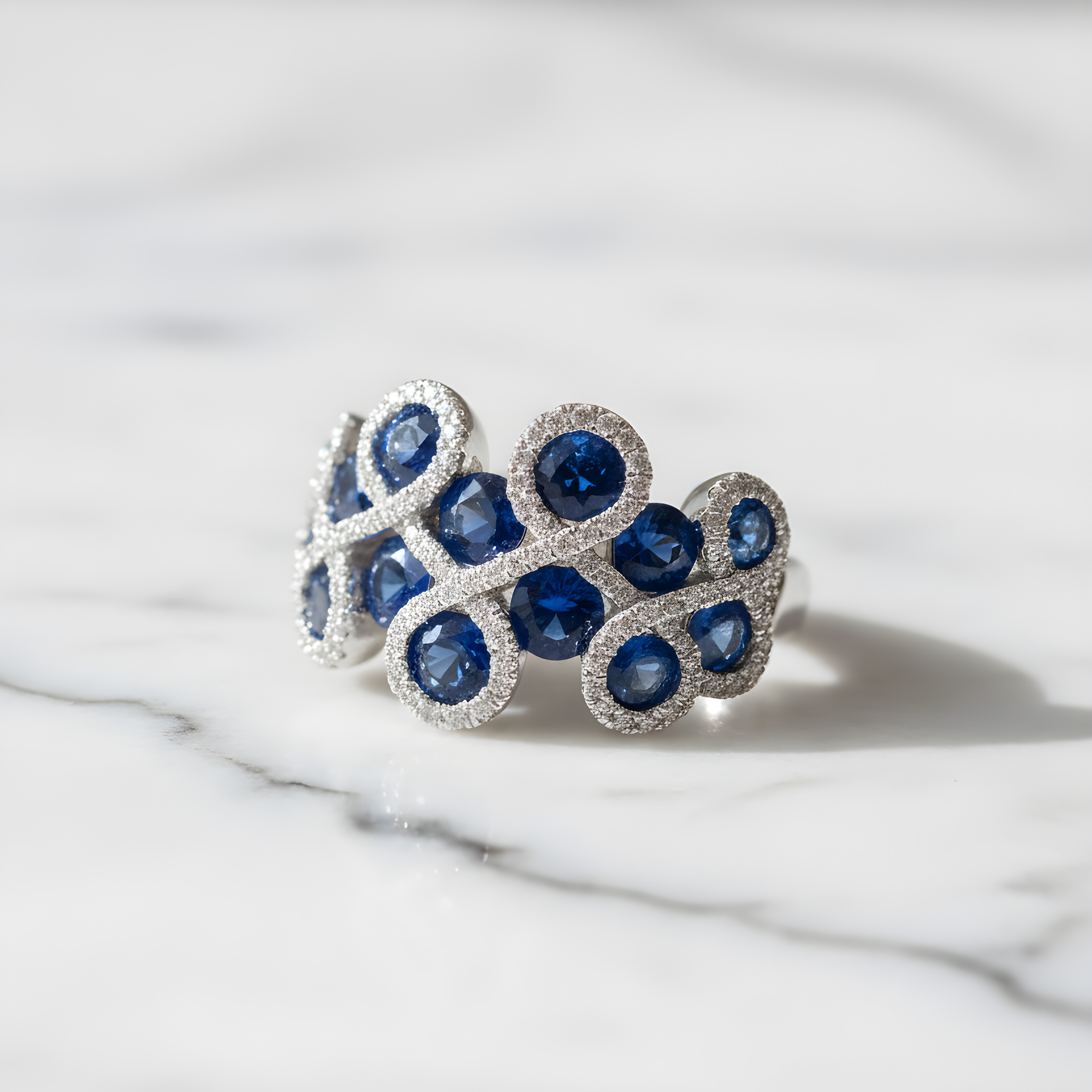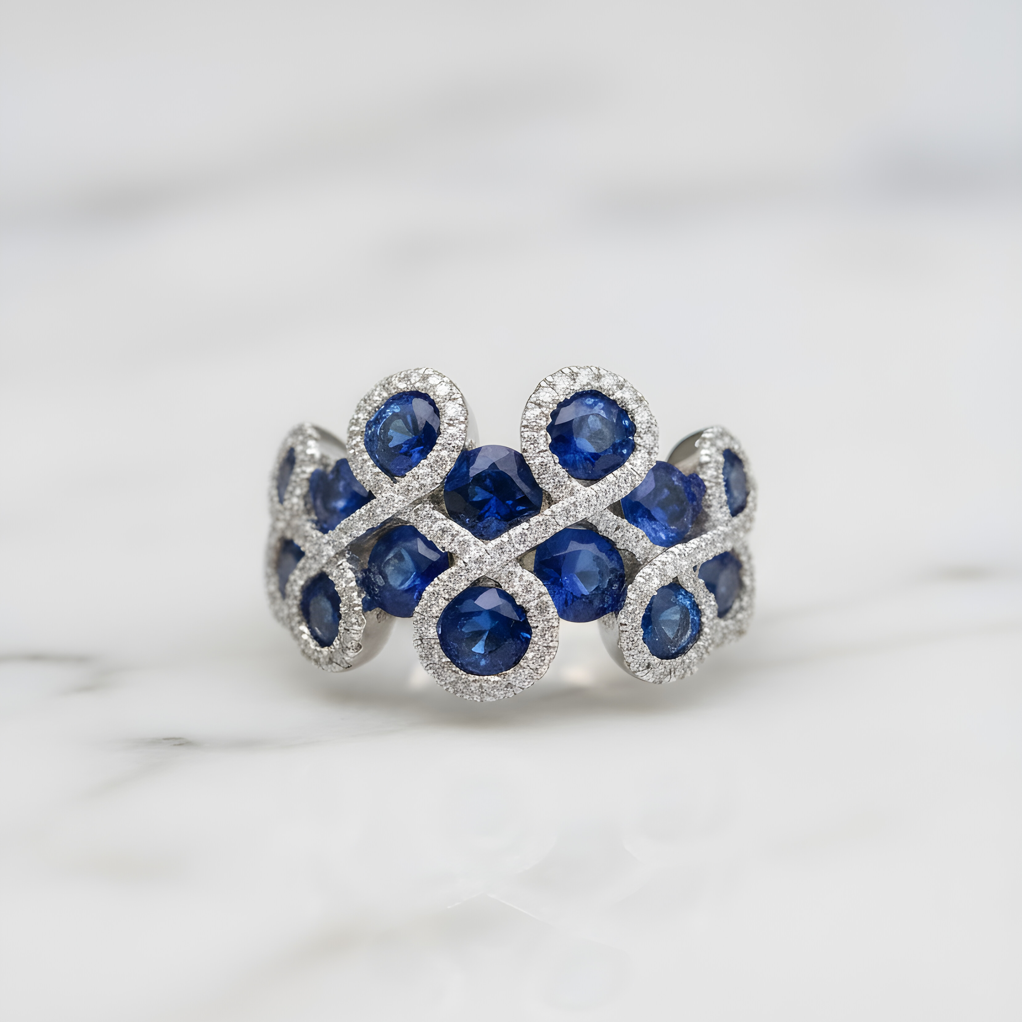 Cette bague en or blanc 750/1000ᵉ captive par son élégance raffinée et sa brillance exceptionnelle. Le contraste saisissant entre les saphirs bleus profonds et les diamants étincelants crée une harmonie parfaite qui attire tous les regards. Chaque pierre ronde est minutieusement sertie pour maximiser leur éclat naturel, tandis que les 6 grammes d'or blanc offrent une présence substantielle à votre doigt. Les saphirs bleus, symboles de fidélité et de sagesse, s'allient à la pureté éternelle des diamants pour composer un bijou aussi significatif que splendide.