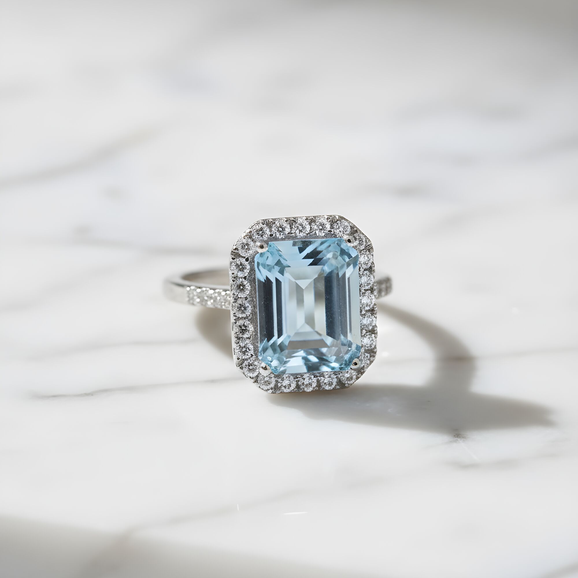 Cette bague en or blanc séduit par son design raffiné et son éclat lumineux. En son centre, une topaze bleue taille rectangulaire attire le regard par sa transparence cristalline et ses nuances délicates, sublimées par une taille précise qui maximise la réflexion de la lumière.