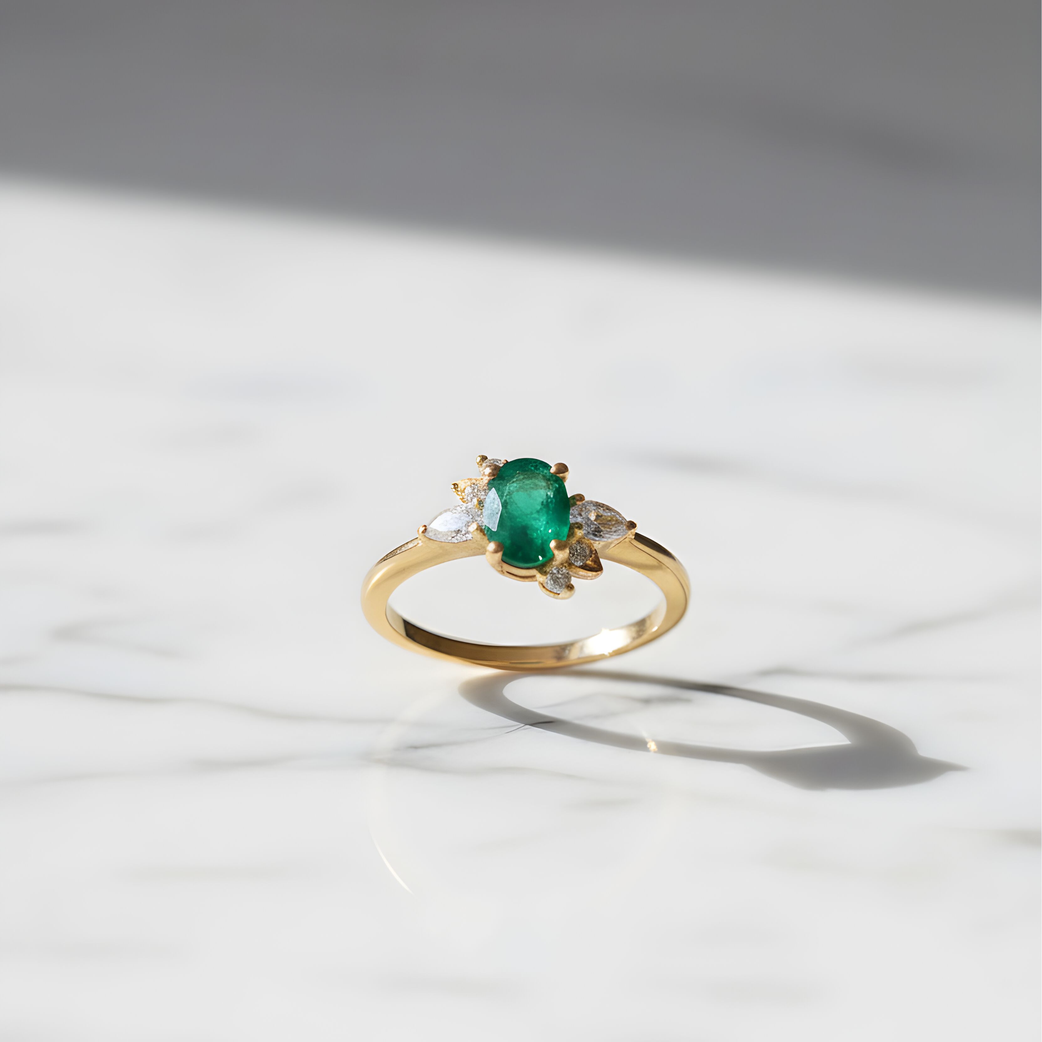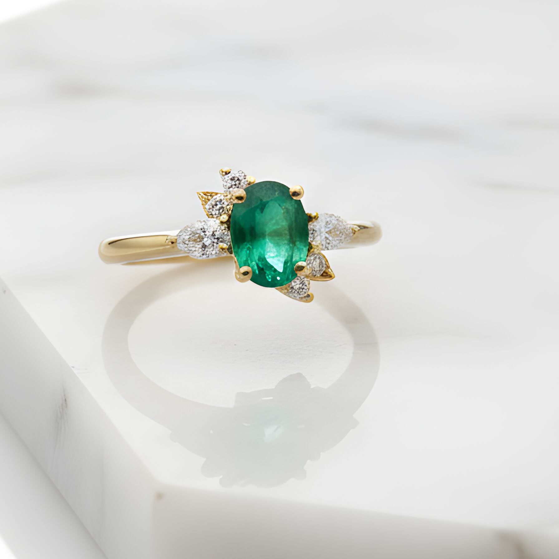Bague or jaune, émeraude taille ovale, diamants poire et brillant