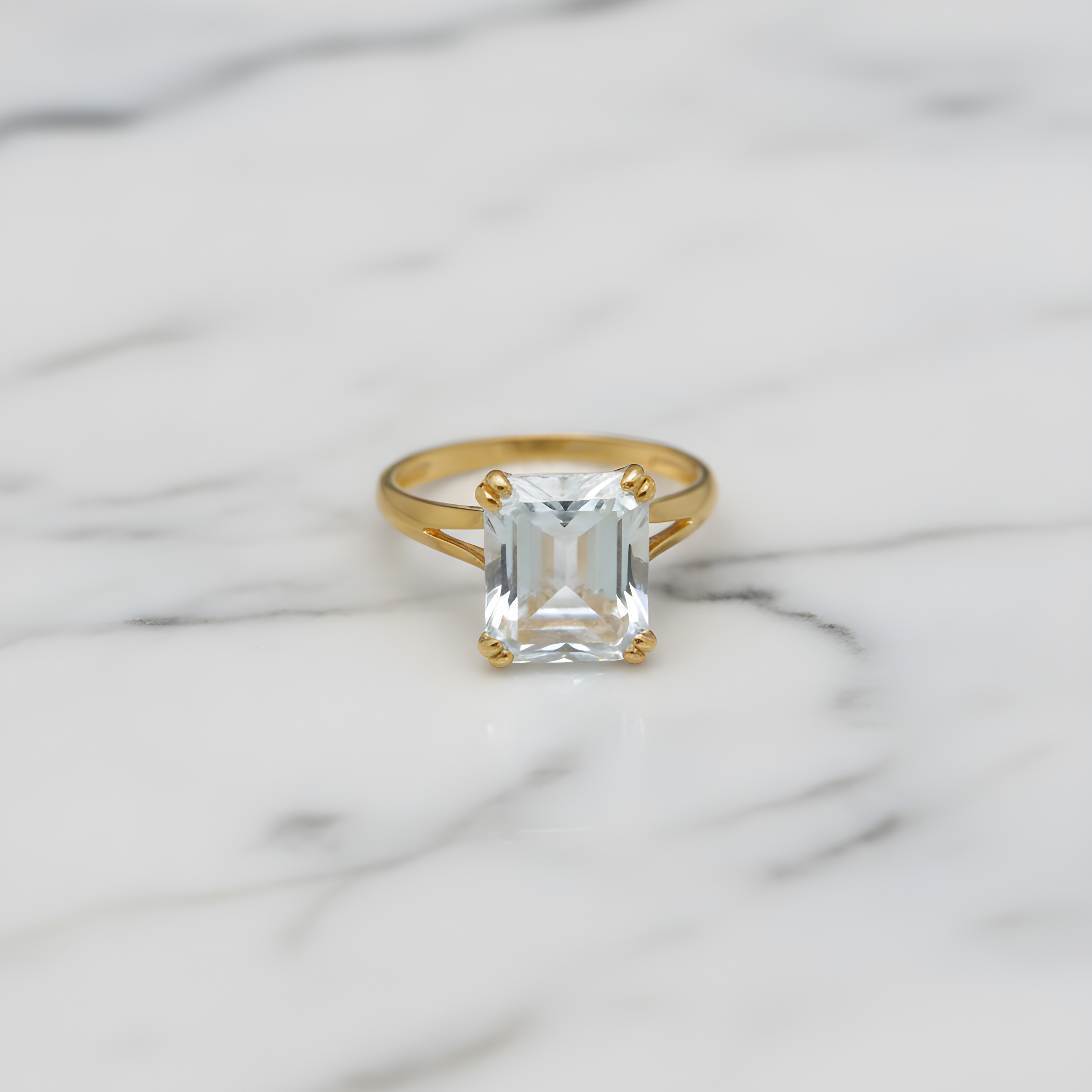Le corps de bague en or jaune apporte chaleur et contraste, soulignant la pureté de l’aigue-marine et renforçant son éclat.
