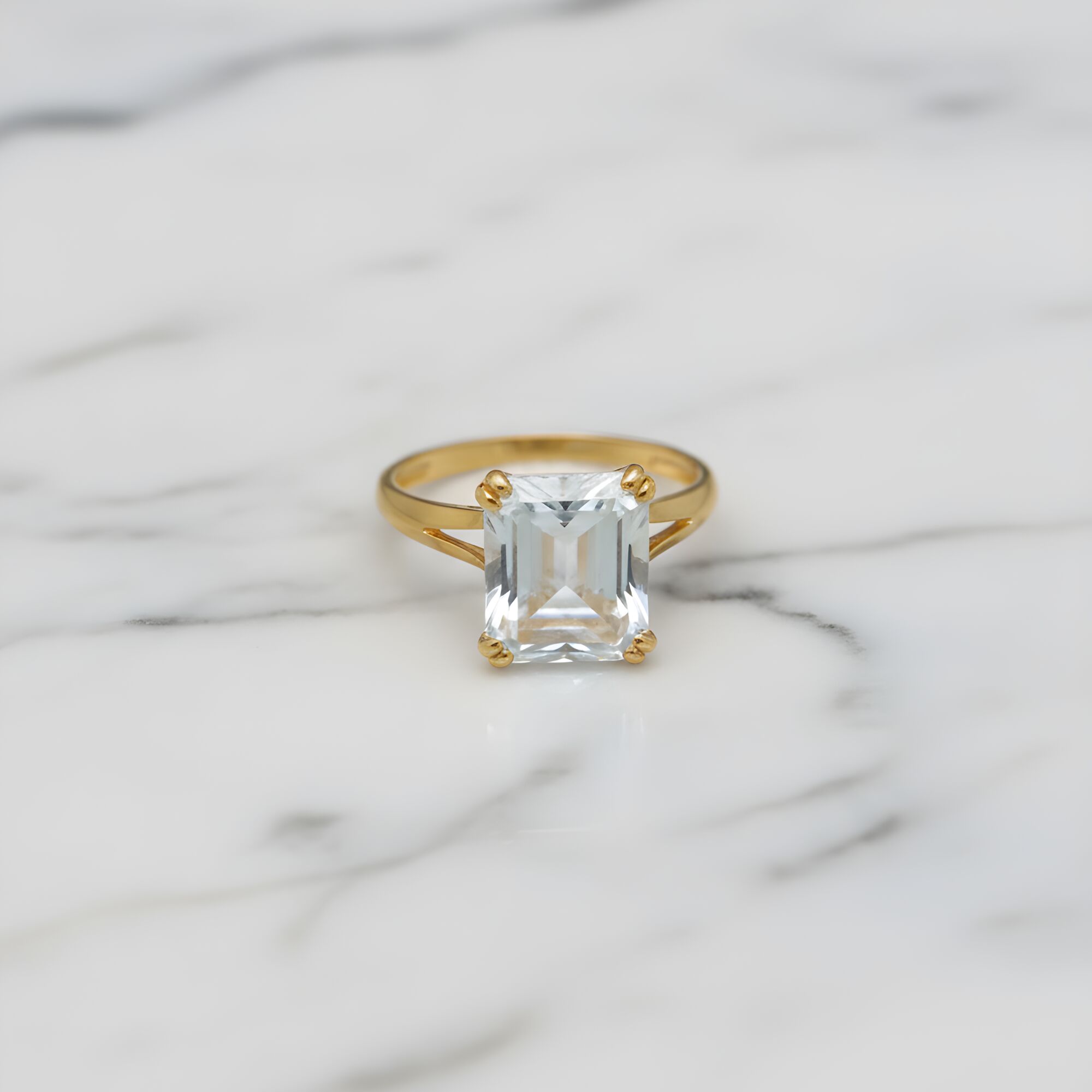 Élégante et lumineuse, cette bague en or jaune met en valeur une superbe aigue-marine taille rectangle, soigneusement sertie par quatre griffes double. Sa pierre centrale aux reflets bleu clair offre une brillance cristalline et une élégance naturelle, idéale pour celles et ceux qui recherchent un bijou raffiné et intemporel.