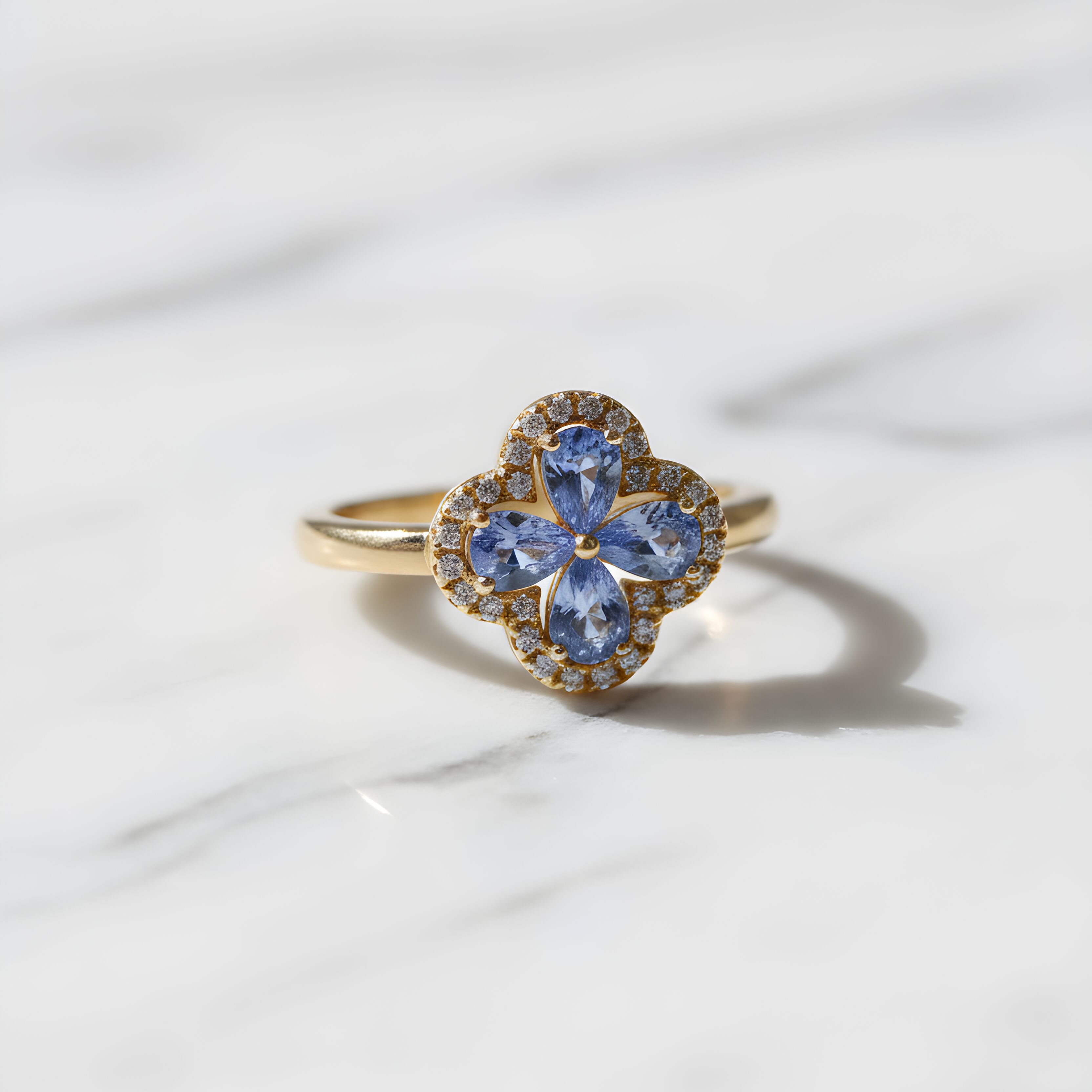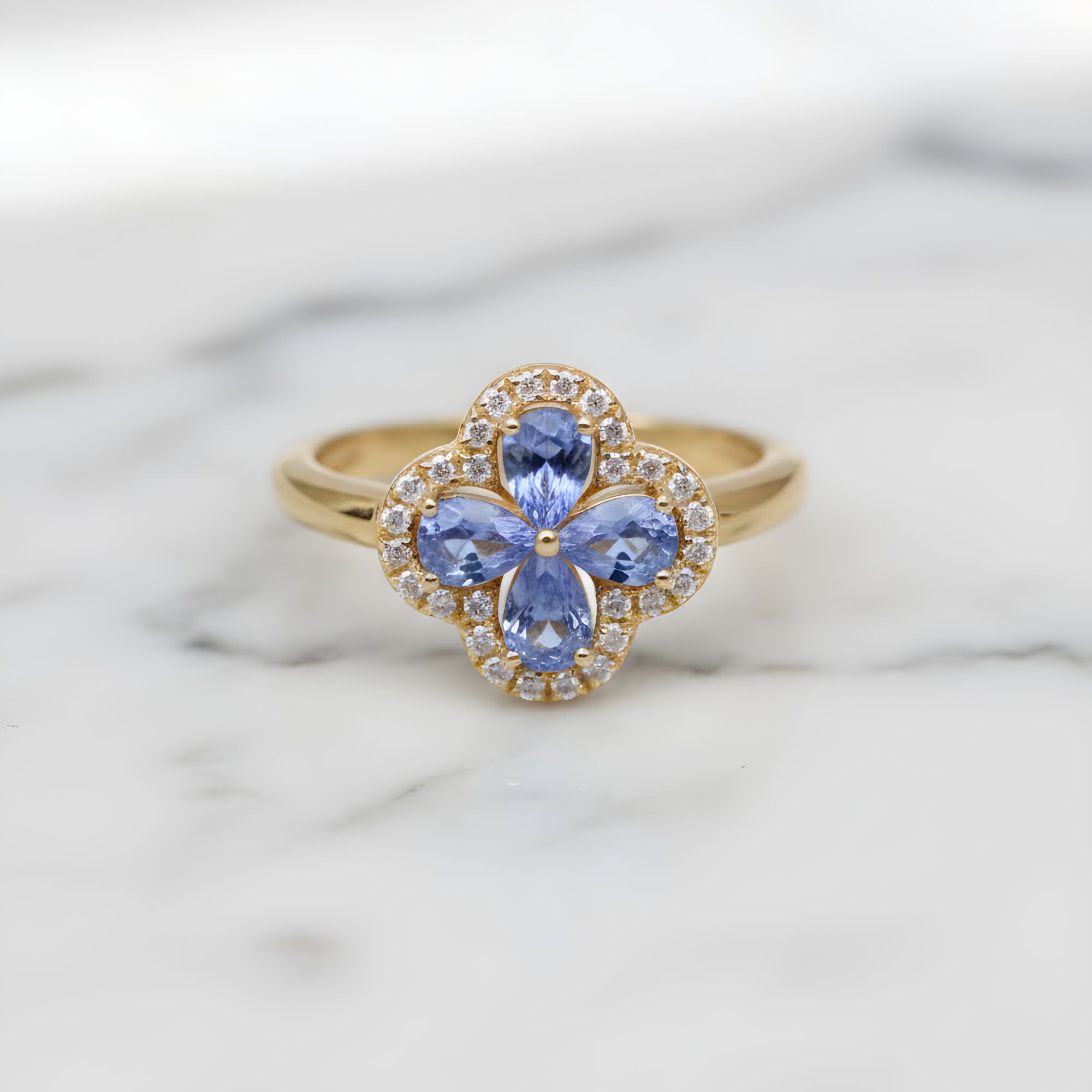 Cette bague en or jaune séduit par son motif trèfle, symbole d’élégance et de chance. Elle est ornée de saphirs de Ceylan aux nuances bleu intense, sublimés par un entourage de diamants taille brillant qui apporte éclat et raffinement.