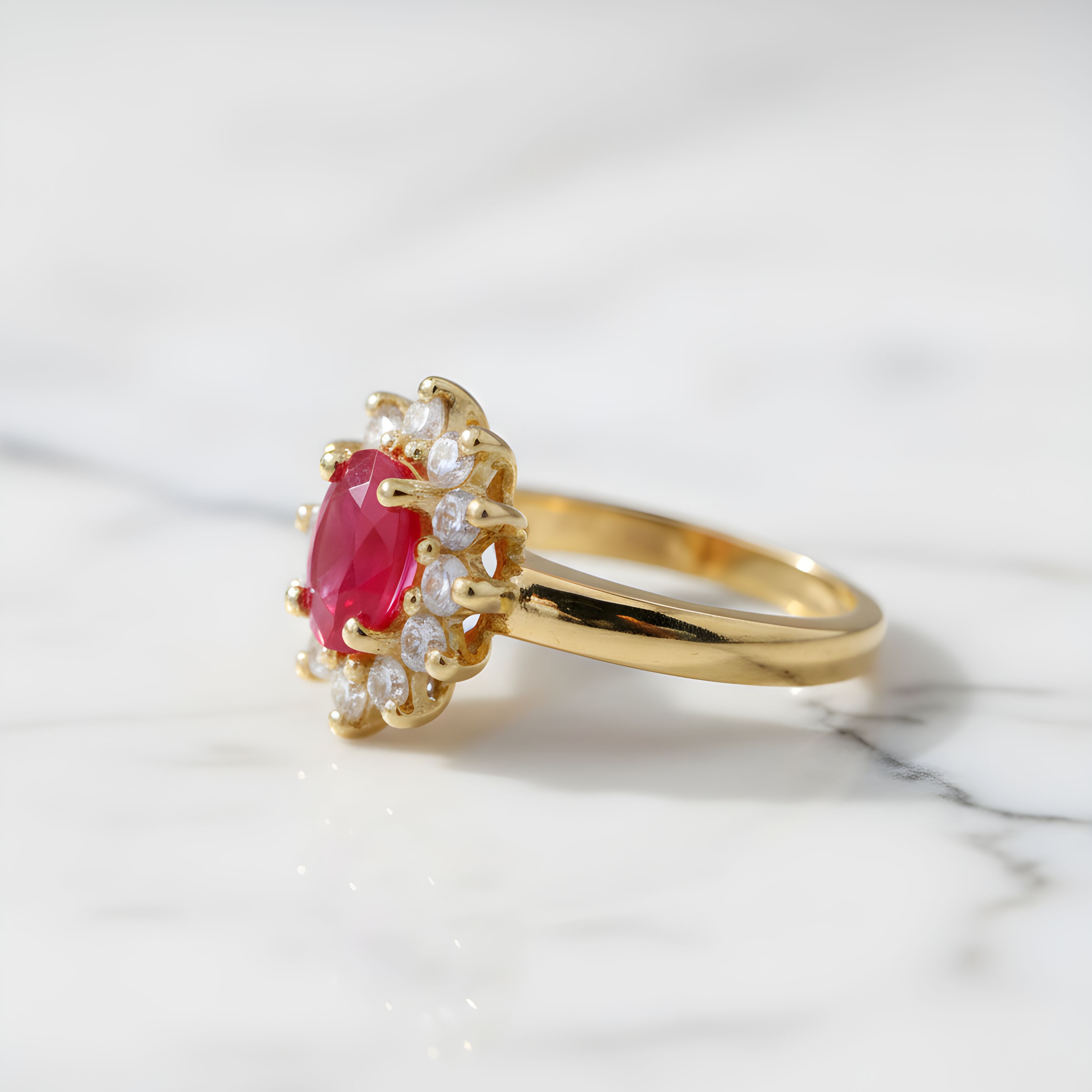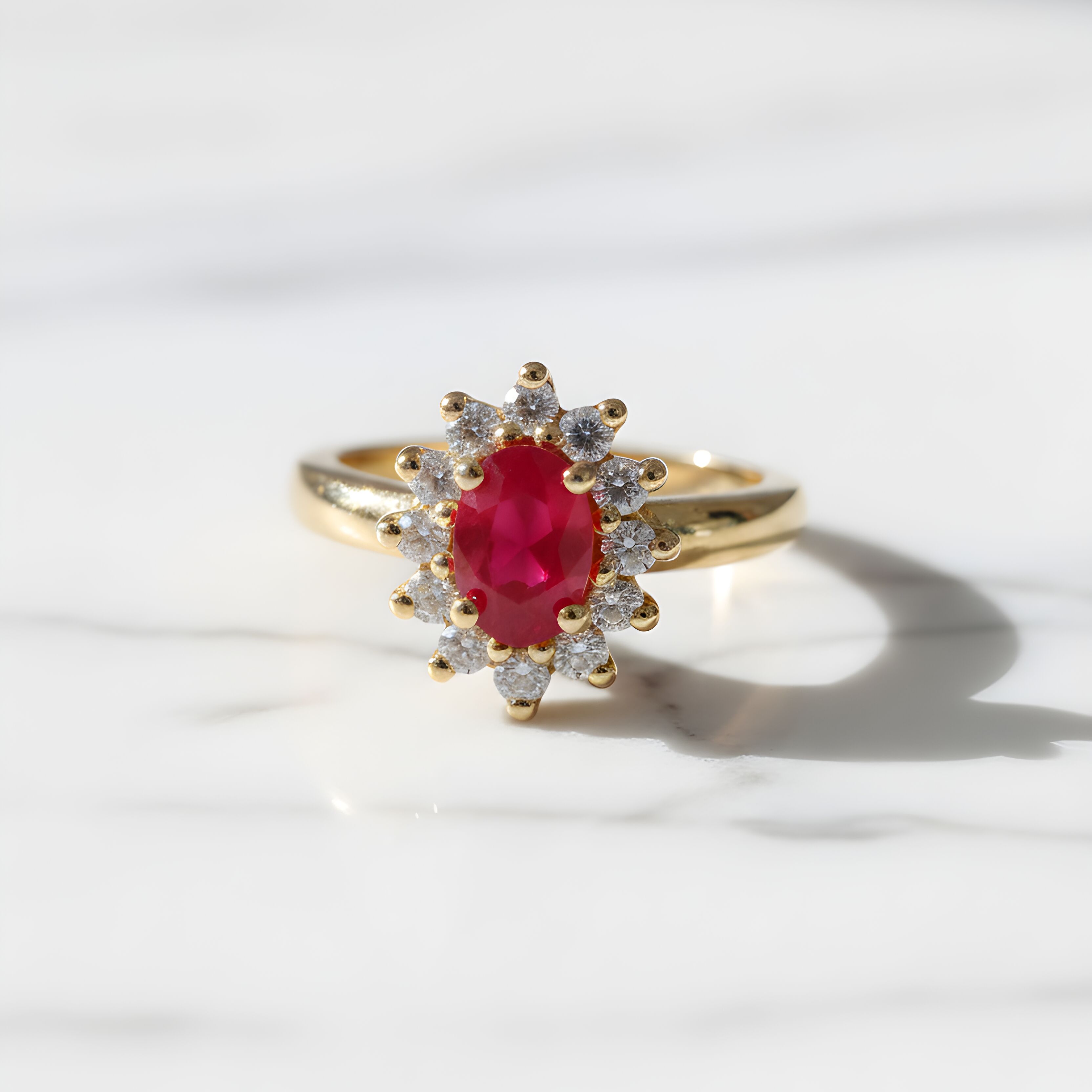 Cette bague en or jaune met en lumière un rubis central à la couleur rouge intense, sublimé par un entourage de diamants taille brillant qui accentue son éclat et sa profondeur. Le sertissage classique et équilibré offre une belle présence au doigt, tout en restant élégant et intemporel.