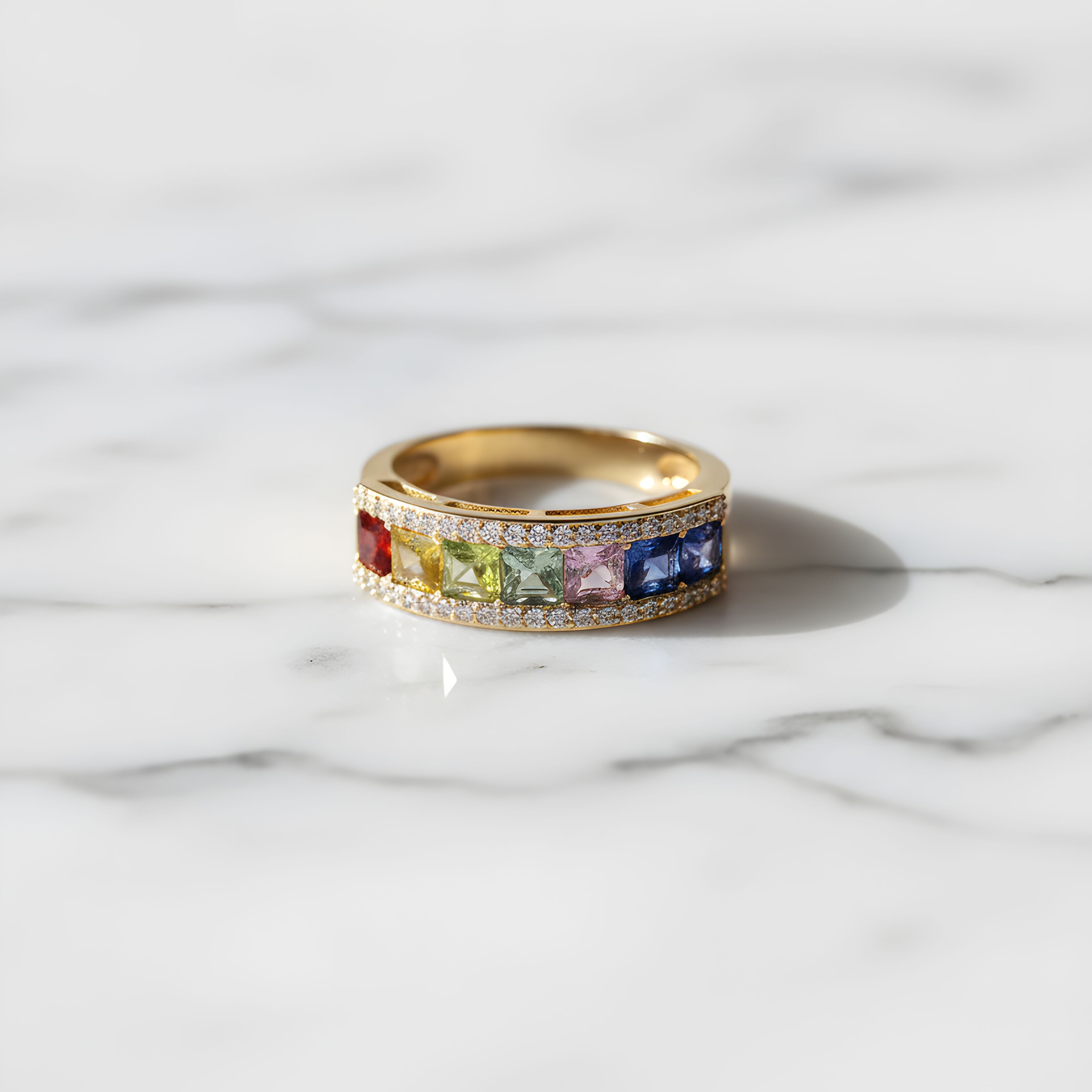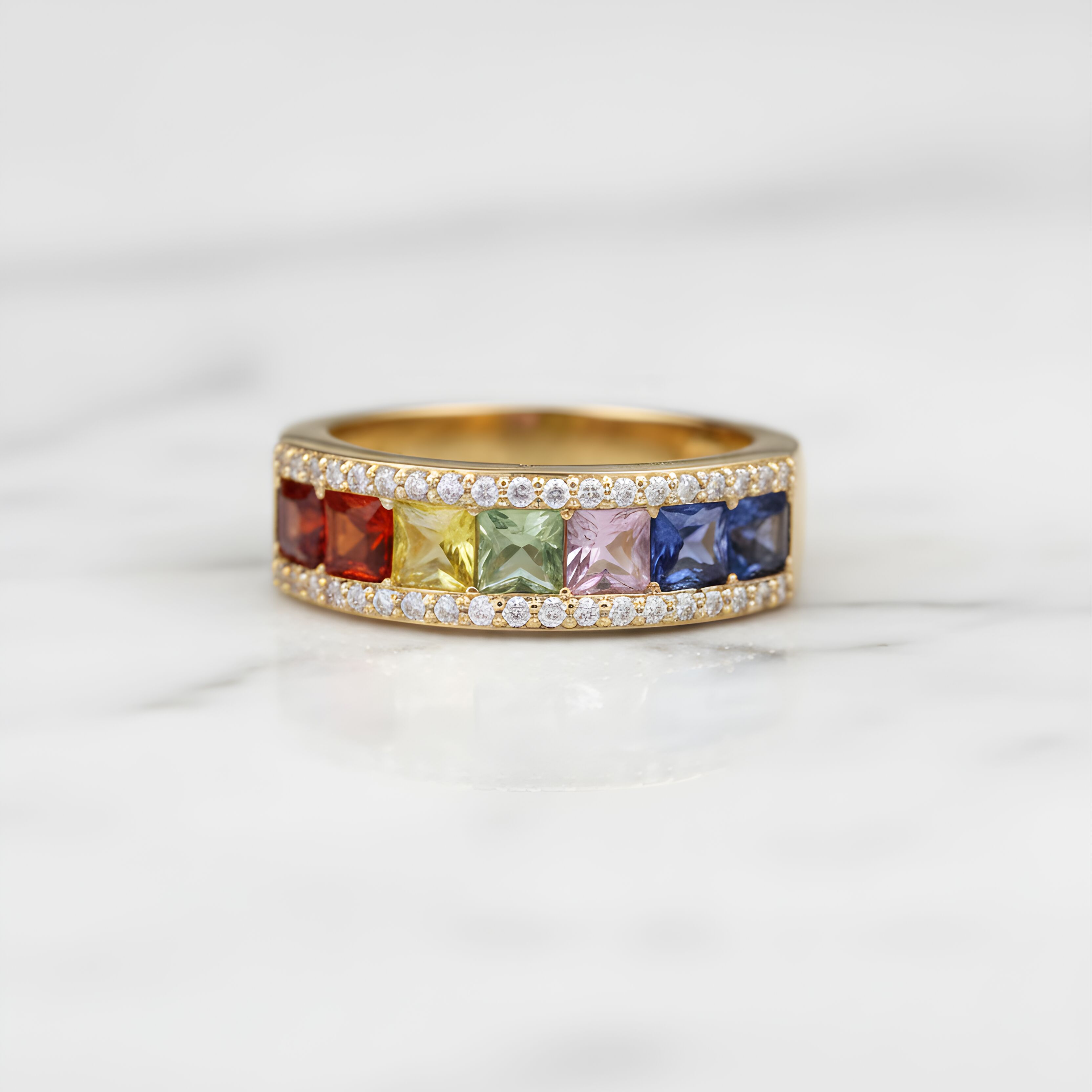 Cette bague en or jaune incarne l’élégance contemporaine et le savoir-faire joaillier à travers une composition lumineuse et audacieuse. Sertie de saphirs de couleur soigneusement sélectionnés aux nuances chaleureuses et délicates, elle offre un jeu de couleurs subtil et sophistiqué.