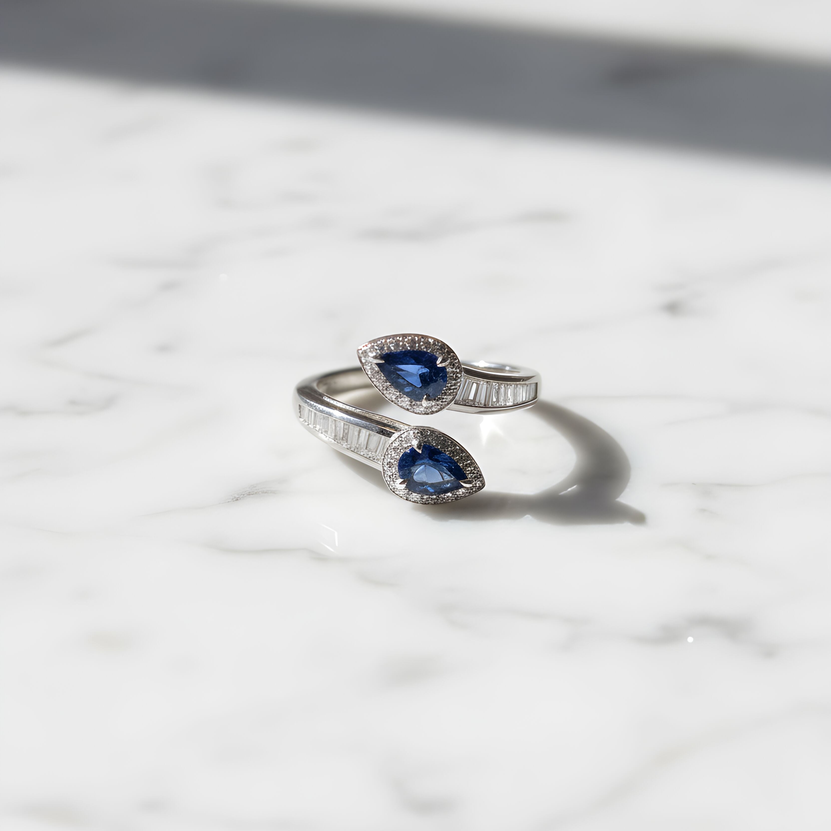 Élégante et symbolique, cette bague Toi & Moi en or blanc incarne l’union parfaite entre design contemporain et tradition joaillière. Elle met en scène deux saphirs bleus taille poire, disposés en miroir, symbole de deux destins qui se rencontrent et s’harmonisent.