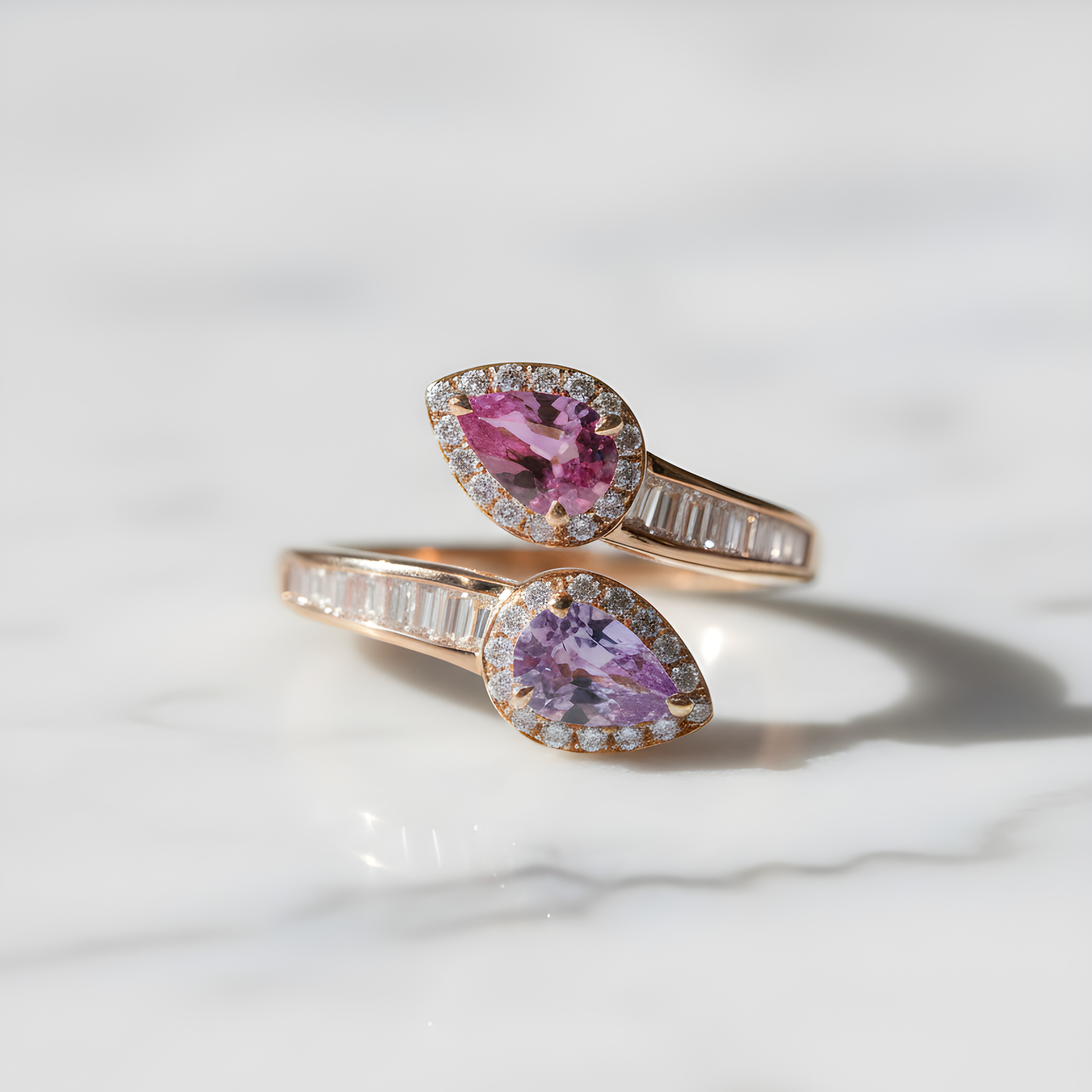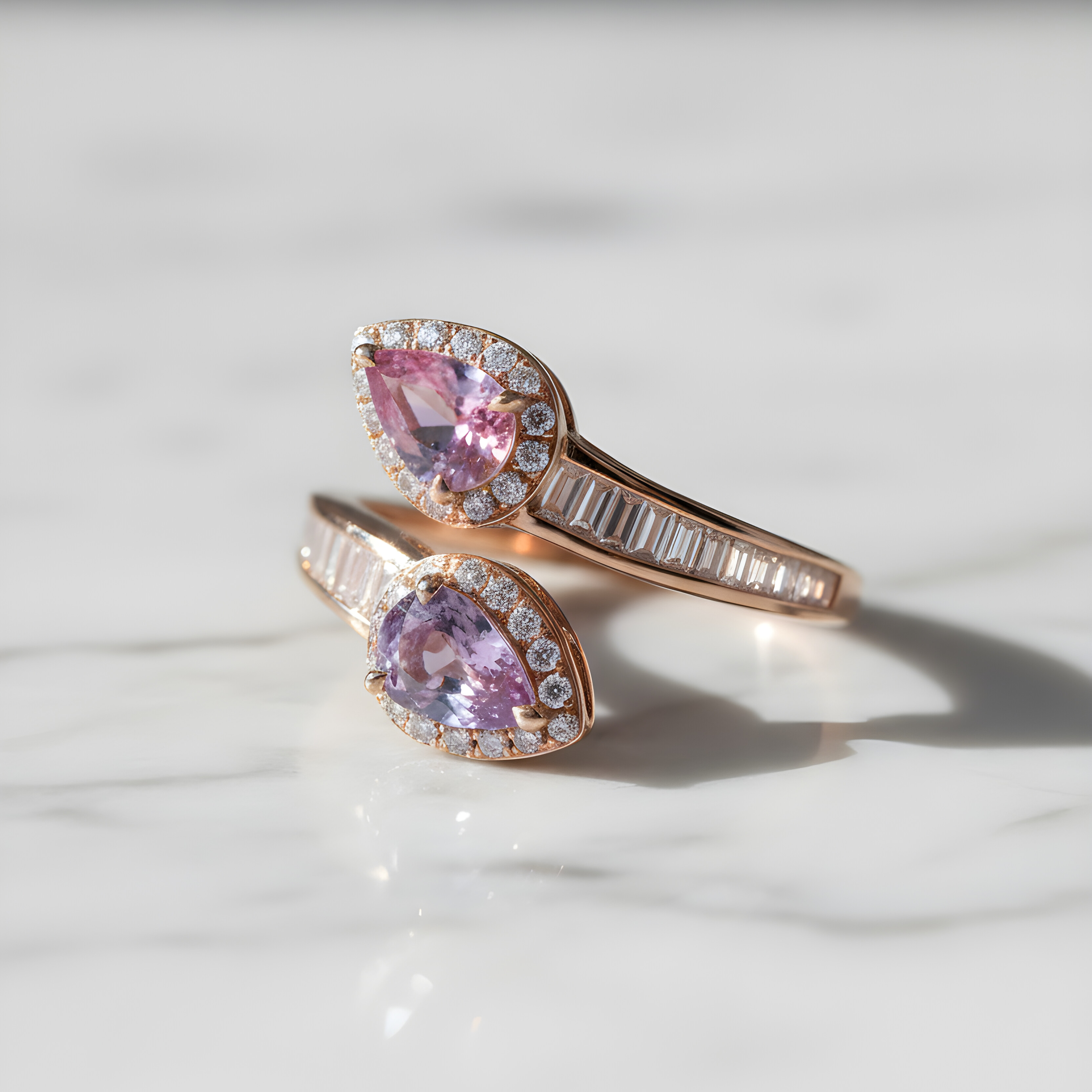 Réalisée en or rose 18 carats, la monture est sublimée par un entourage de diamants qui souligne chaque pierre avec finesse. L’anneau, délicatement serti de diamants taille baguette, apporte une touche contemporaine et structurée à l’ensemble, tout en conservant une grande légèreté visuelle.