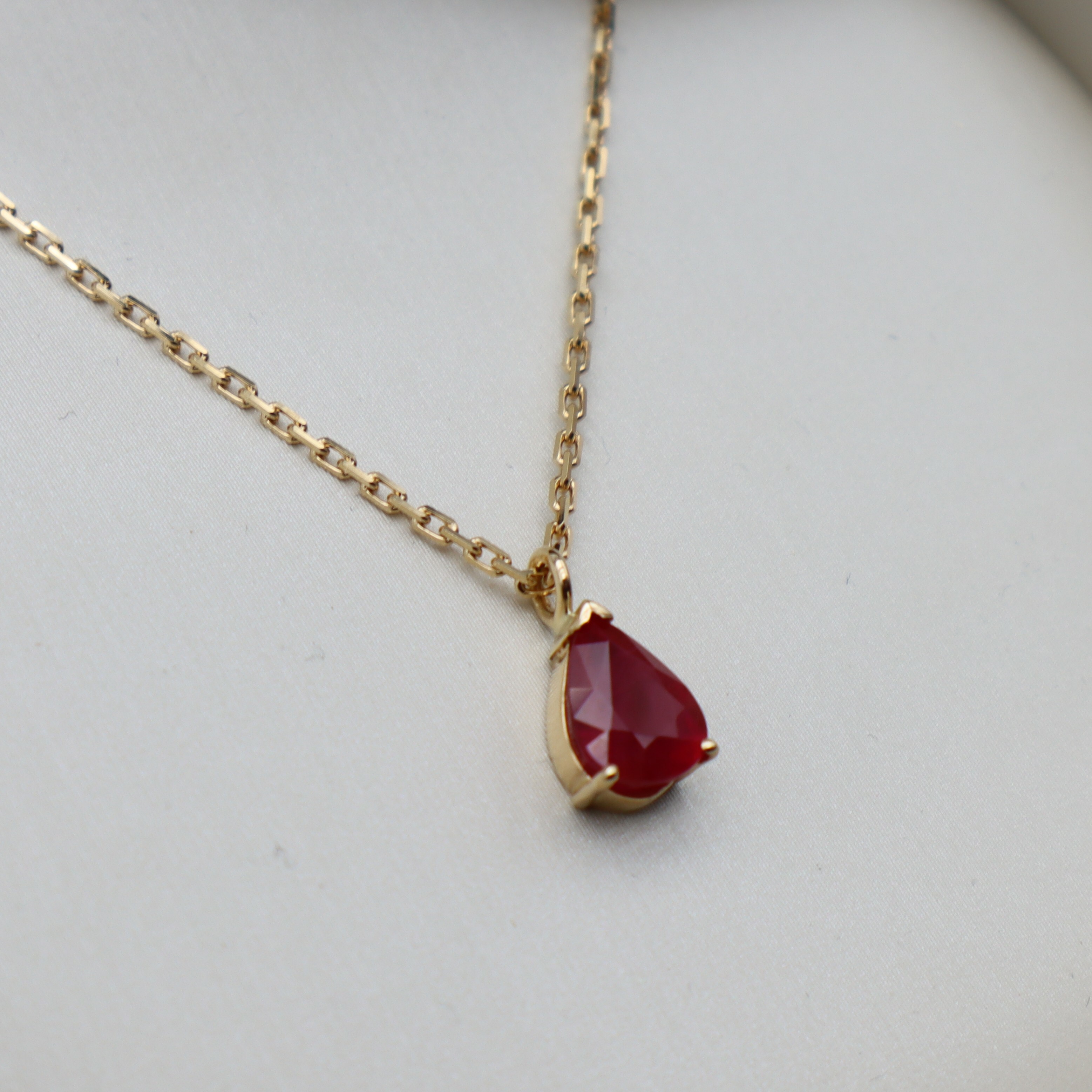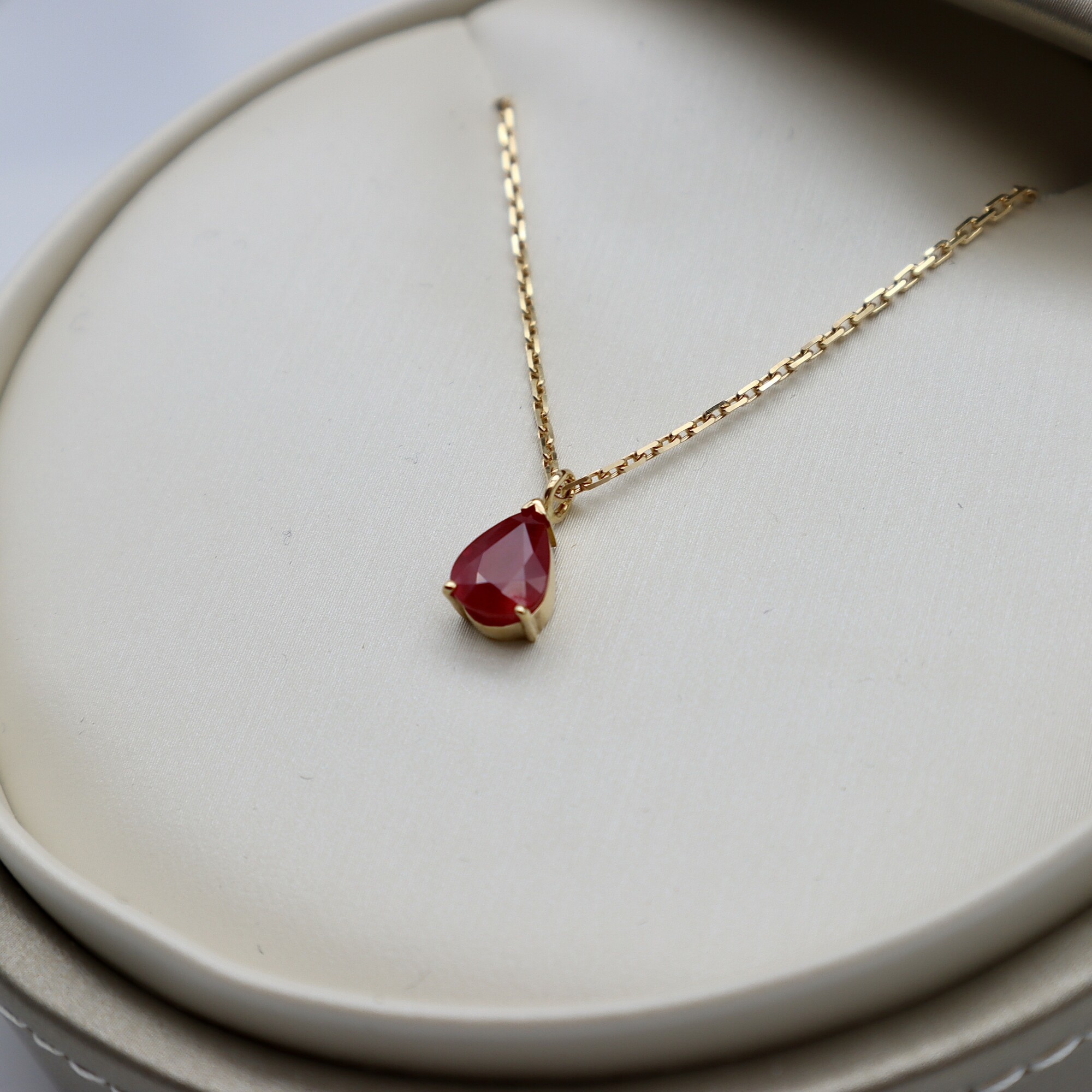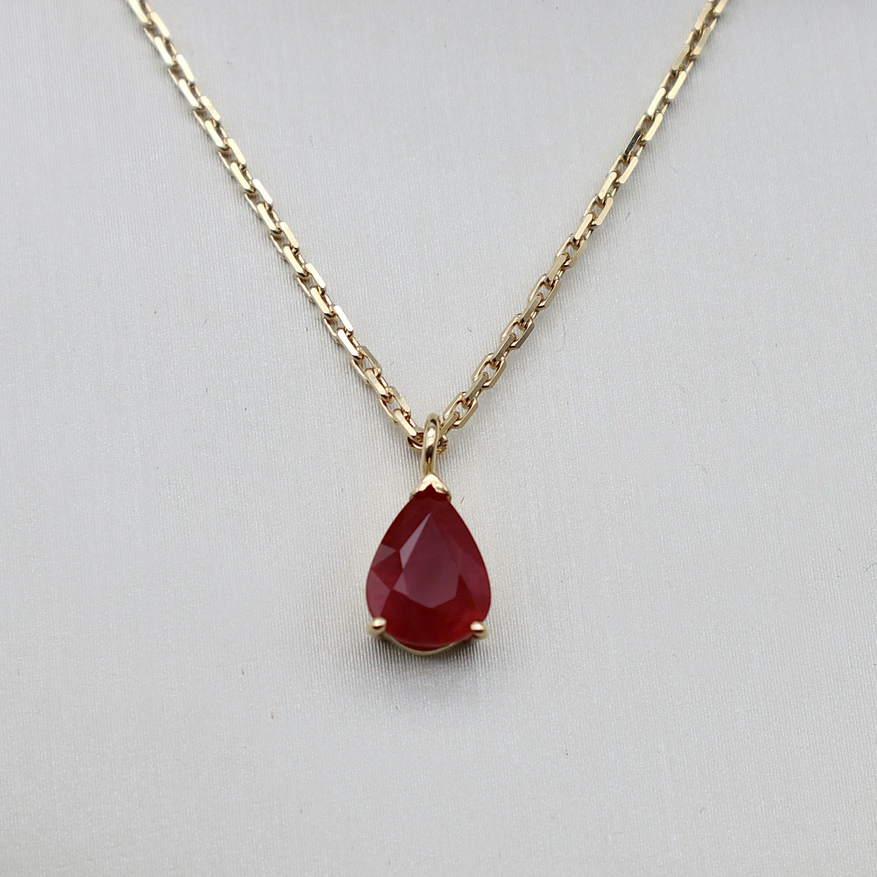Ce collier en or jaune met à l’honneur un rubis taille poire, pierre emblématique de la passion et de l’élégance. Sa teinte rouge intense apporte une profondeur remarquable, captant la lumière avec sobriété et caractère.