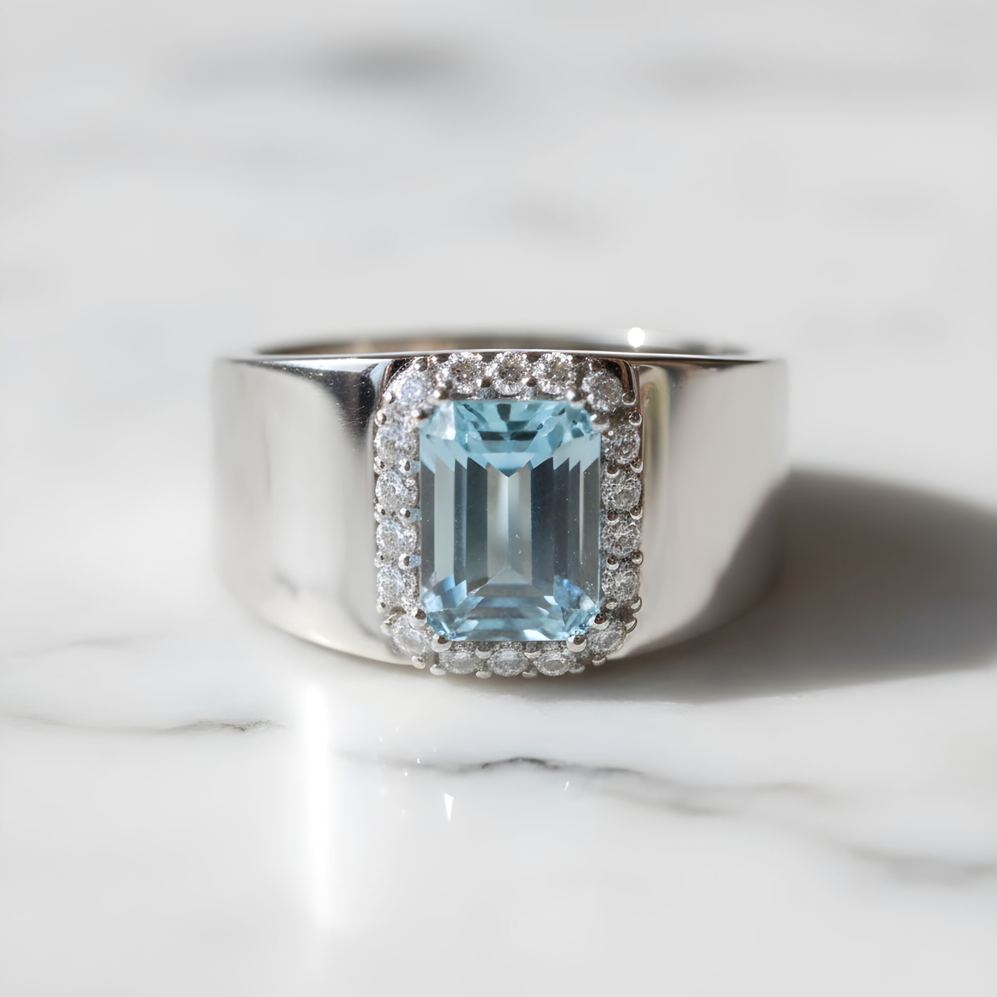 Graphique et résolument contemporaine, cette bague jonc en or blanc se distingue par son design structuré et son élégance affirmée. Au centre, une aigue-marine taille rectangle dévoile une teinte bleu clair cristalline, mise en valeur par un entourage de diamants finement sertis qui accentuent la lumière et la profondeur de la pierre.