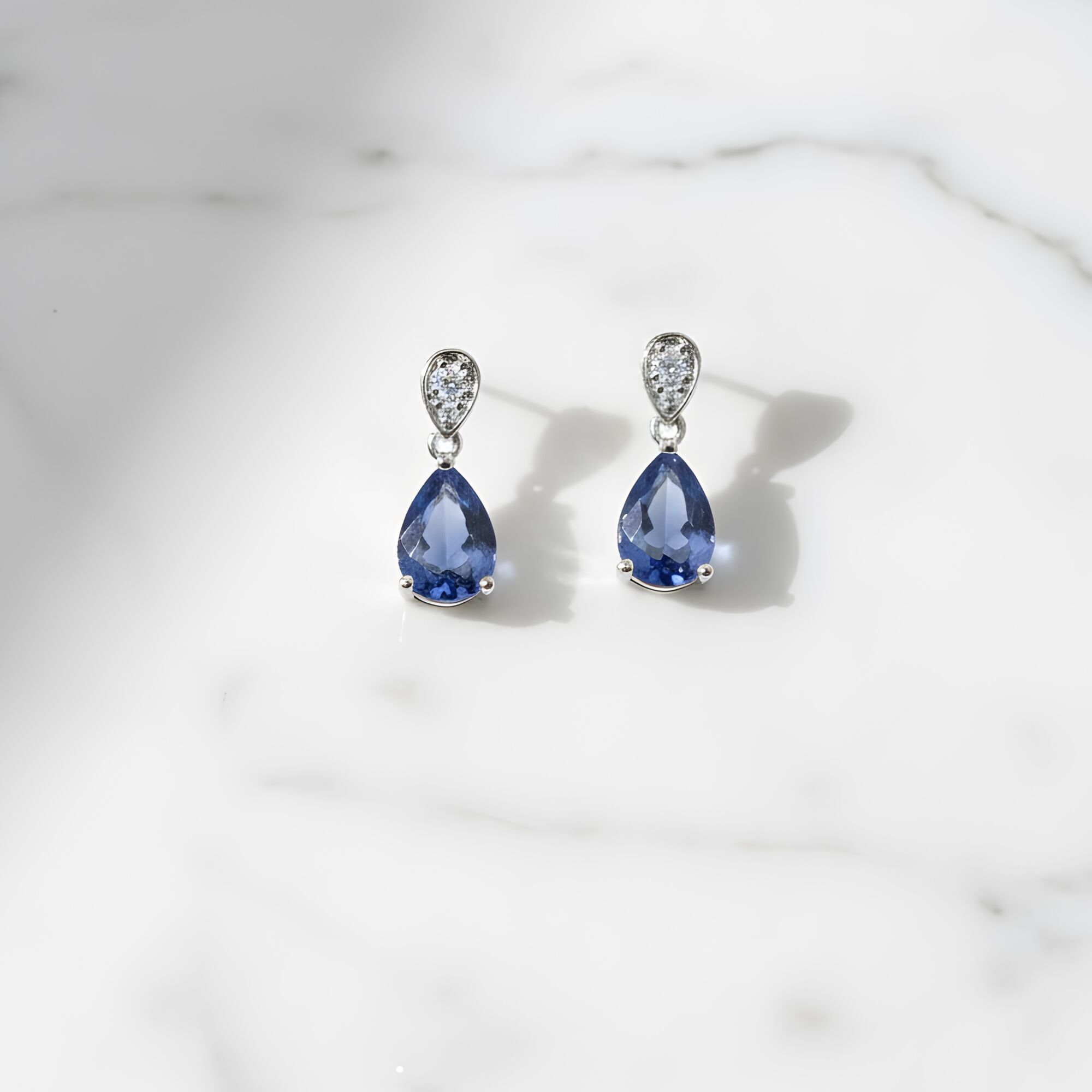 Deux saphirs de Ceylan taille poire, sélectionnés pour la pureté de leur bleu et montés en pendants afin de capter la lumière à chaque mouvement.