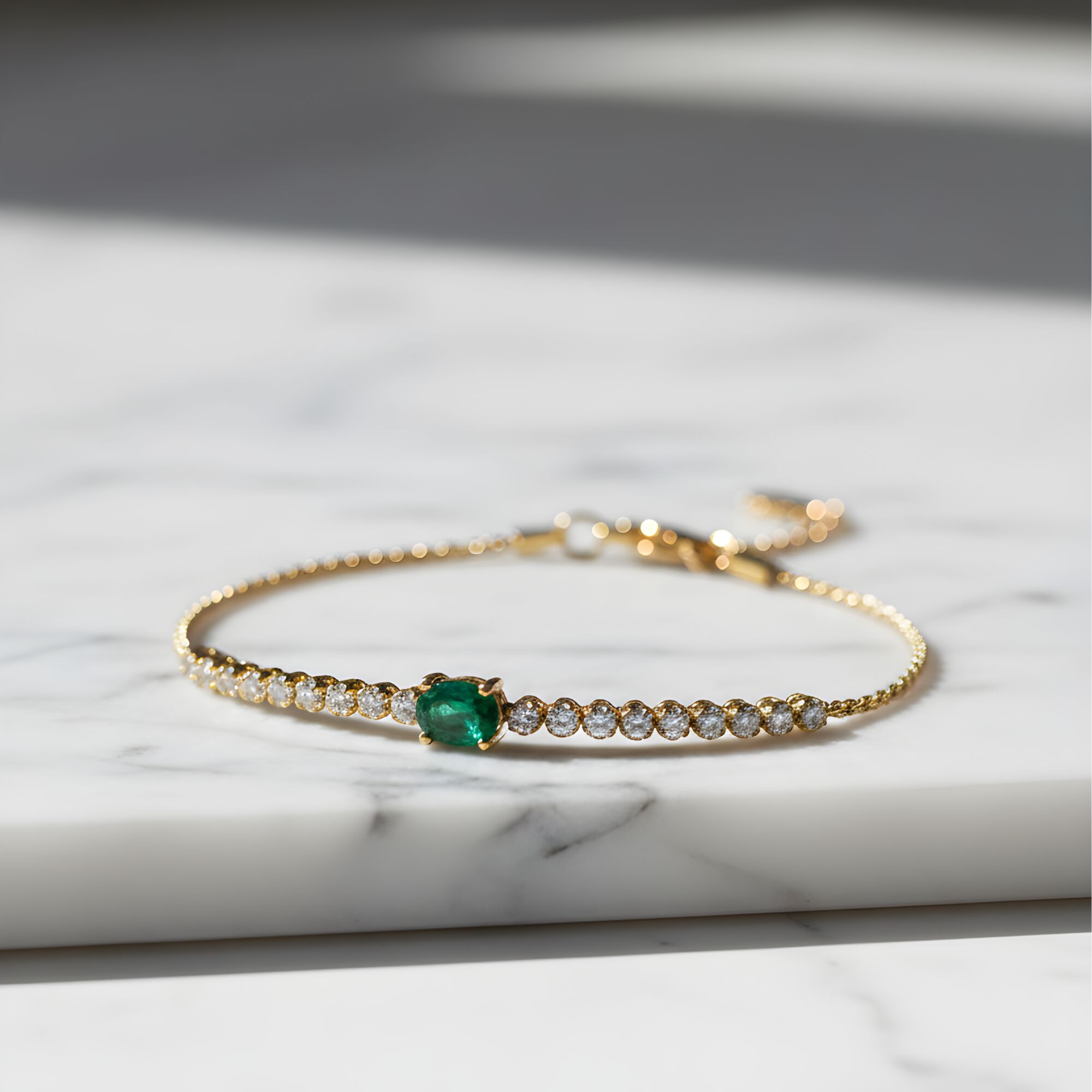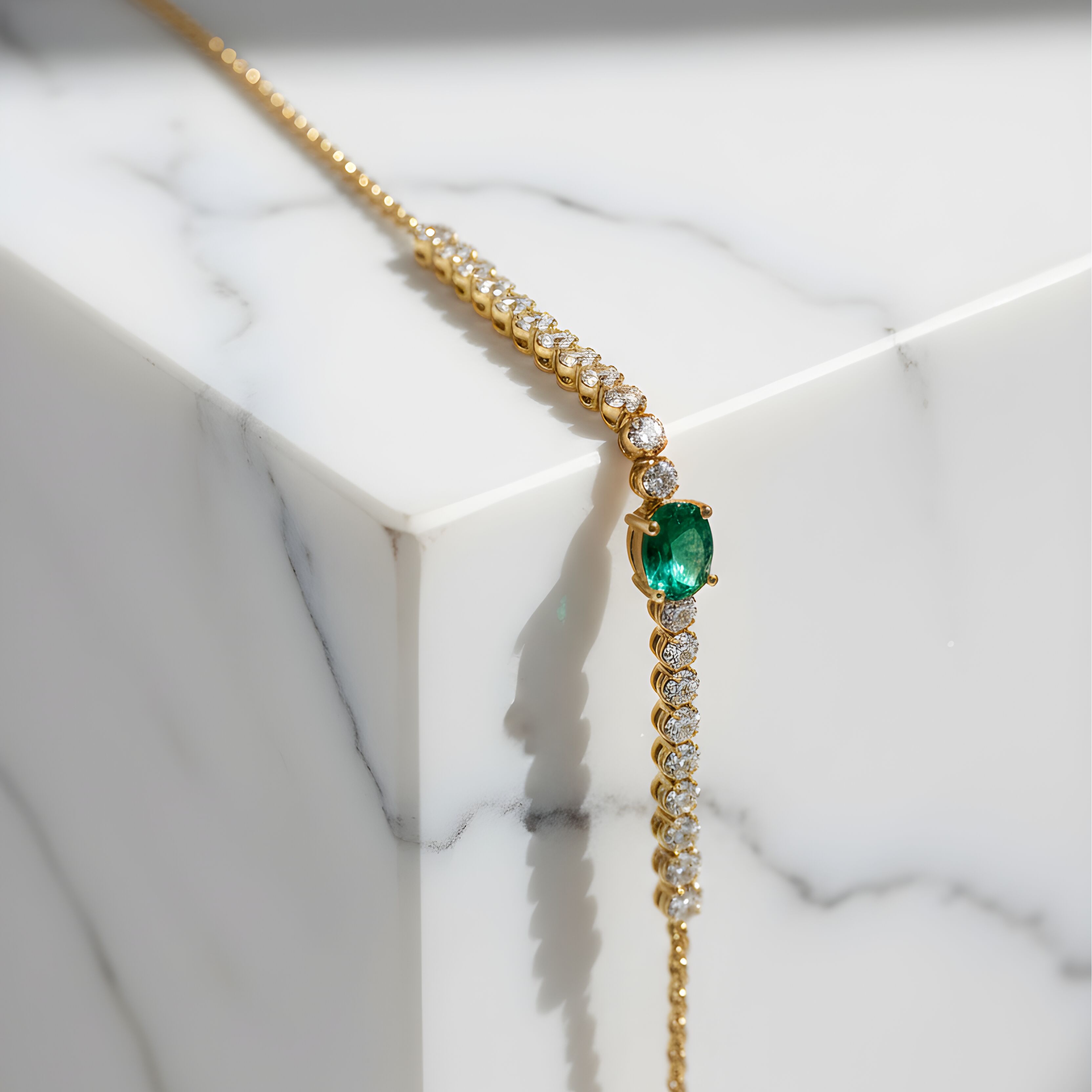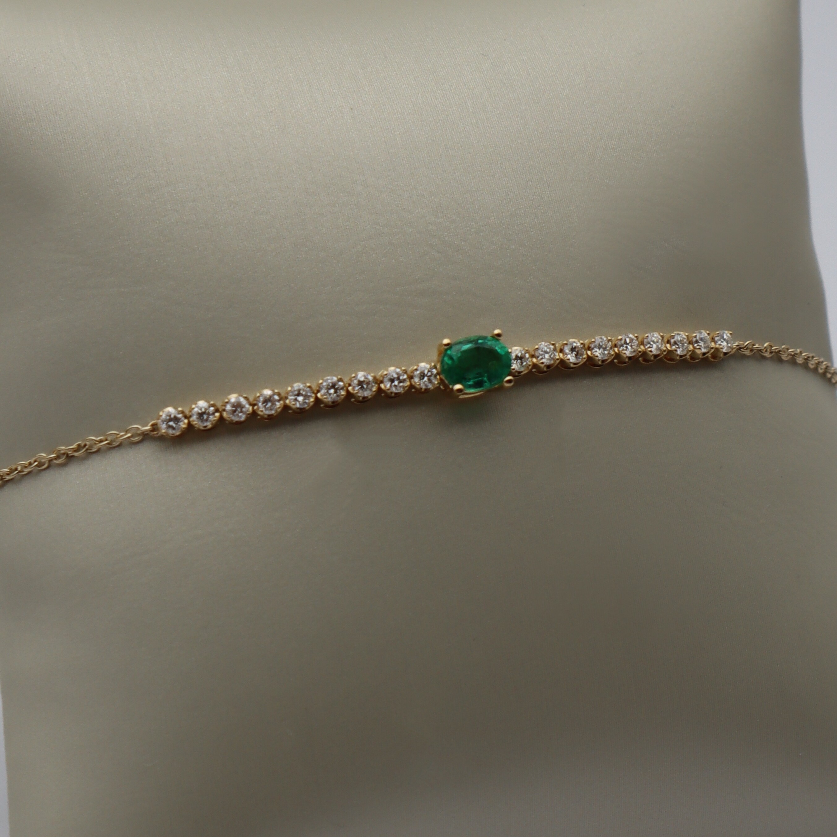 Épuré, précieux et résolument élégant, ce bracelet en or jaune se distingue par une émeraude centrale délicatement sertie, mise en valeur par un alignement de diamants étincelants. L’or jaune apporte une chaleur lumineuse qui sublime le vert profond de l’émeraude, tandis que les diamants accentuent la finesse et la régularité du design.