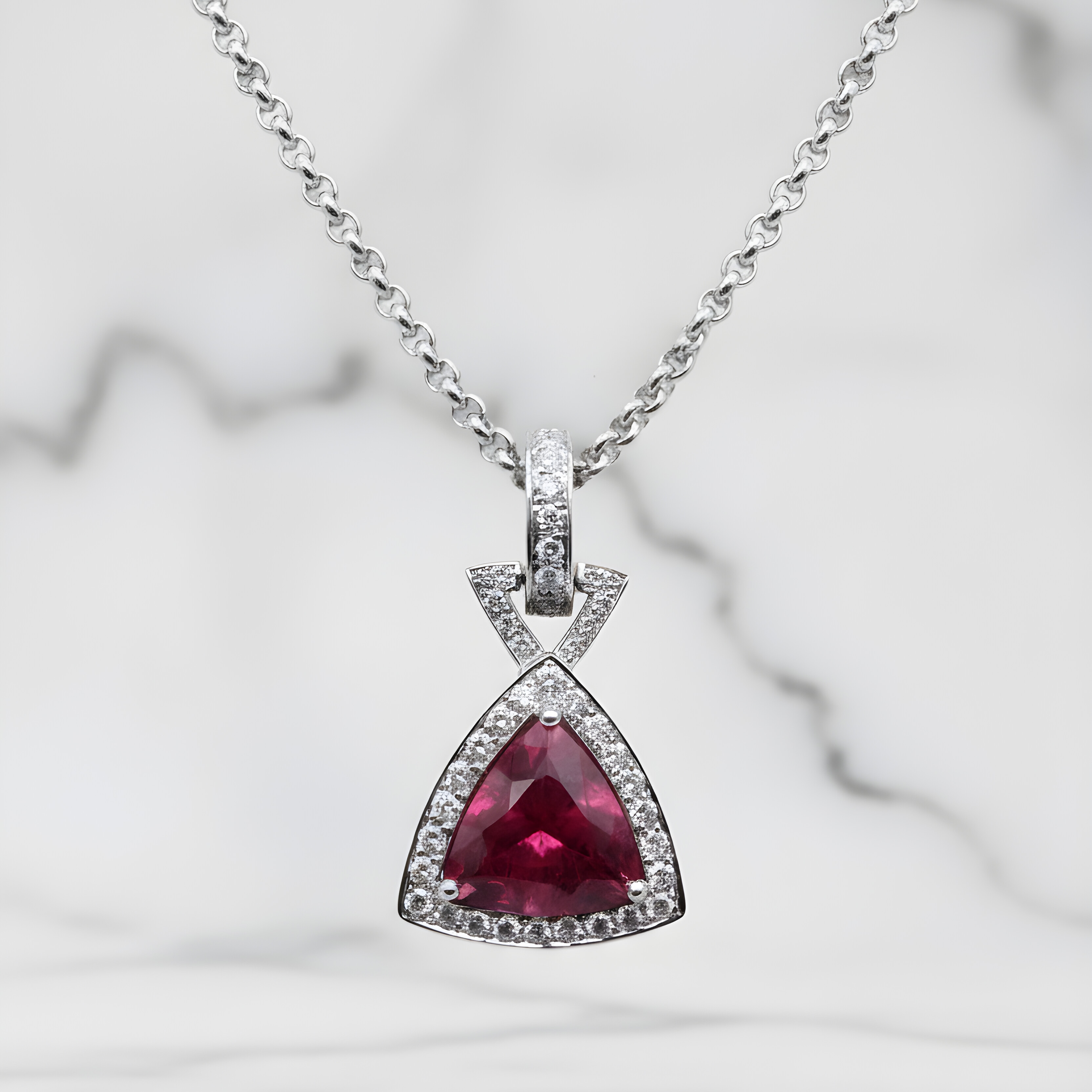 Ce collier en or blanc révèle un pendentif d’une grande intensité, sublimé par une rubellite taille triangulaire aux nuances profondes et vibrantes. Sa couleur framboise, rare et expressive, capte immédiatement le regard et confère à la pièce une présence affirmée.