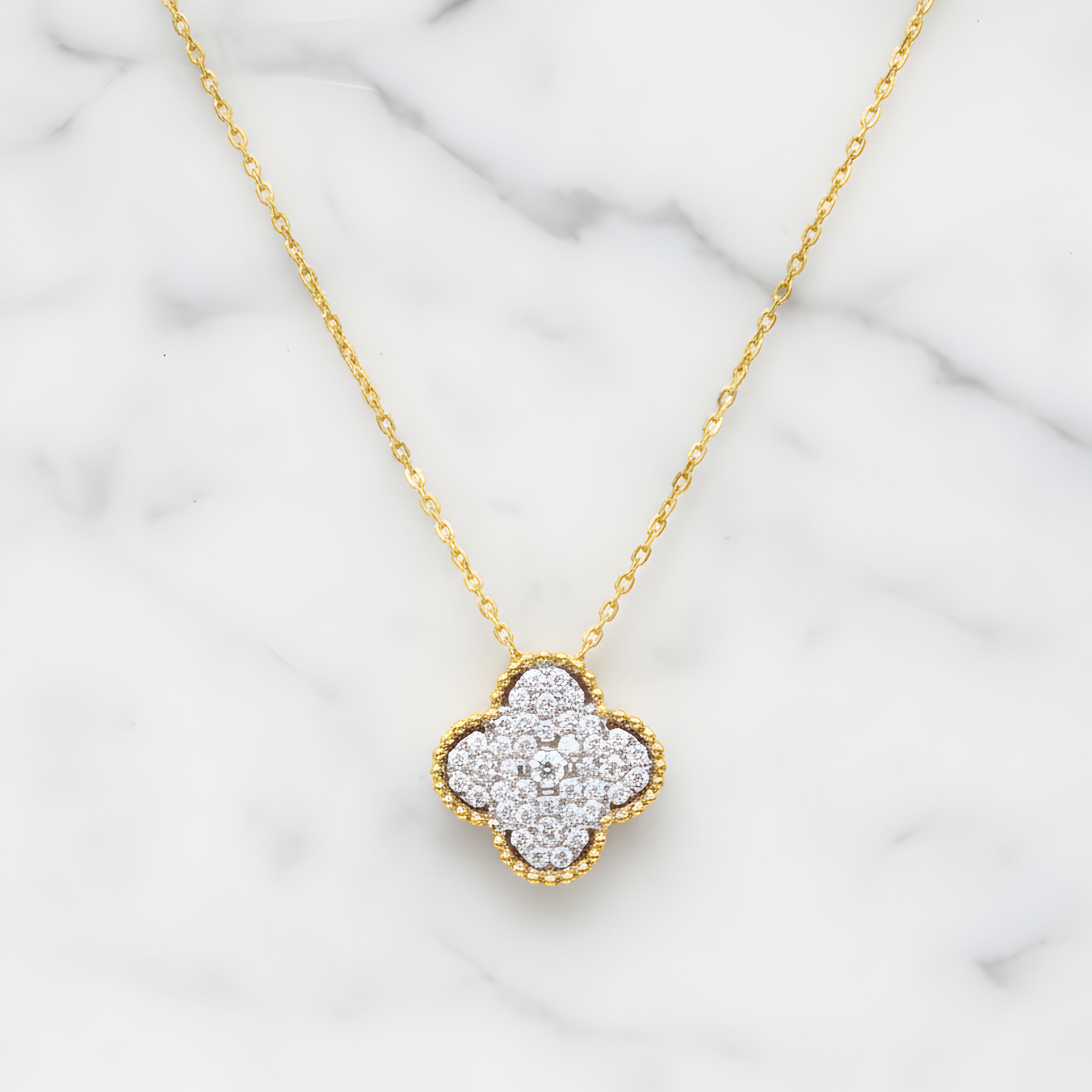Ce collier bicolore en or met en lumière un élégant pendentif trèfle, symbole de chance et d’harmonie. Le motif capte la lumière avec intensité, tandis que le délicat liseré en or jaune souligne le relief et la finesse du serti. La chaîne fine assure un porté fluide et raffiné au quotidien.
