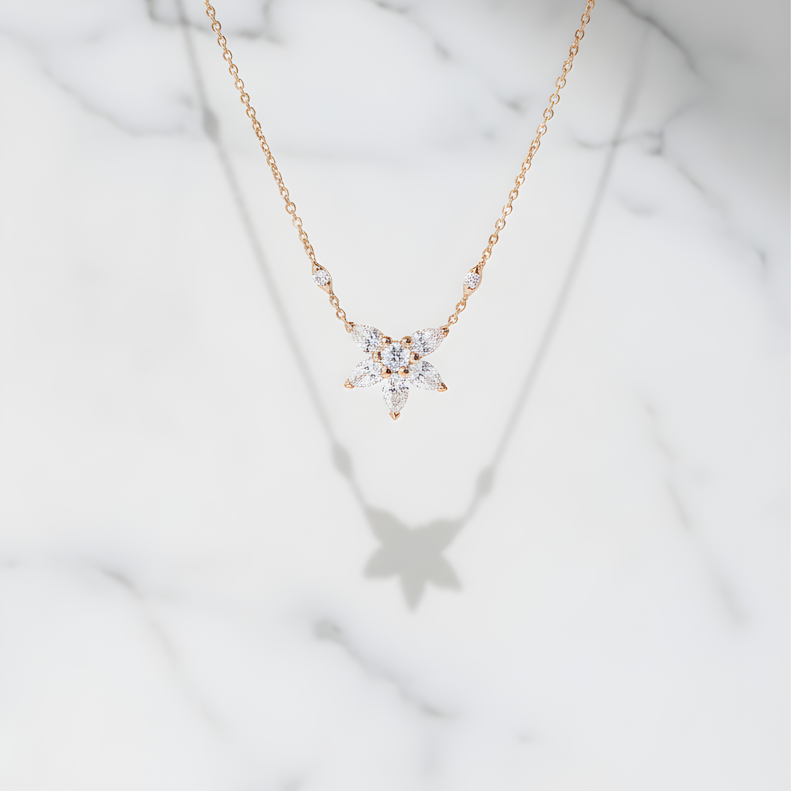 Ce collier en or rose dévoile un motif délicatement floral, composé de diamants taille brillant et poire finement assemblés. L’équilibre des formes et la douceur de l’or rose confèrent à la pièce une élégance lumineuse et contemporaine.