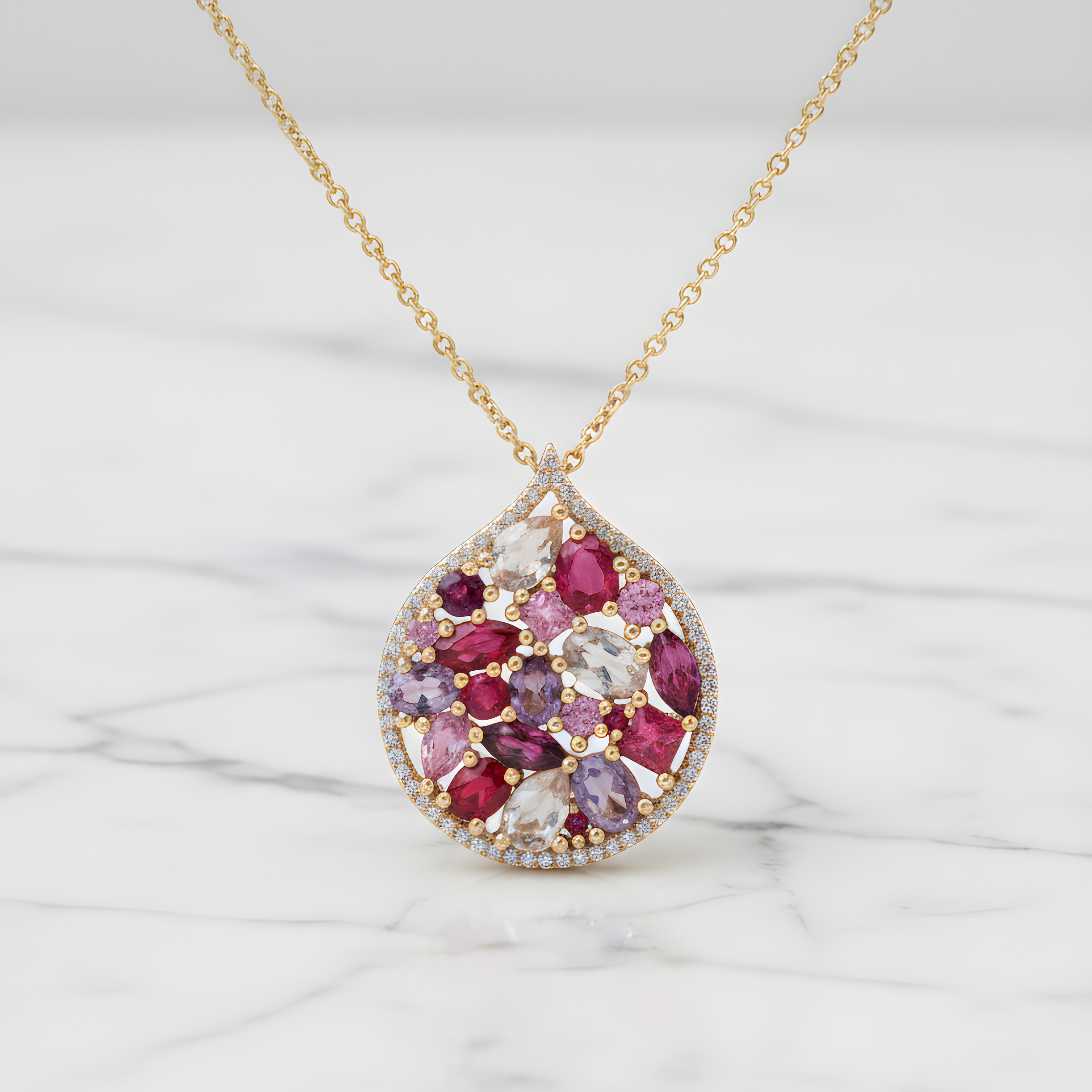 Ce collier en or rose dévoile un pendentif au design délicat, où se mêlent différentes pierres roses aux nuances subtiles. Réunies dans une composition harmonieuse, elles créent un jeu de couleurs lumineux, à la fois doux et sophistiqué, souligné par la chaleur de l’or rose.