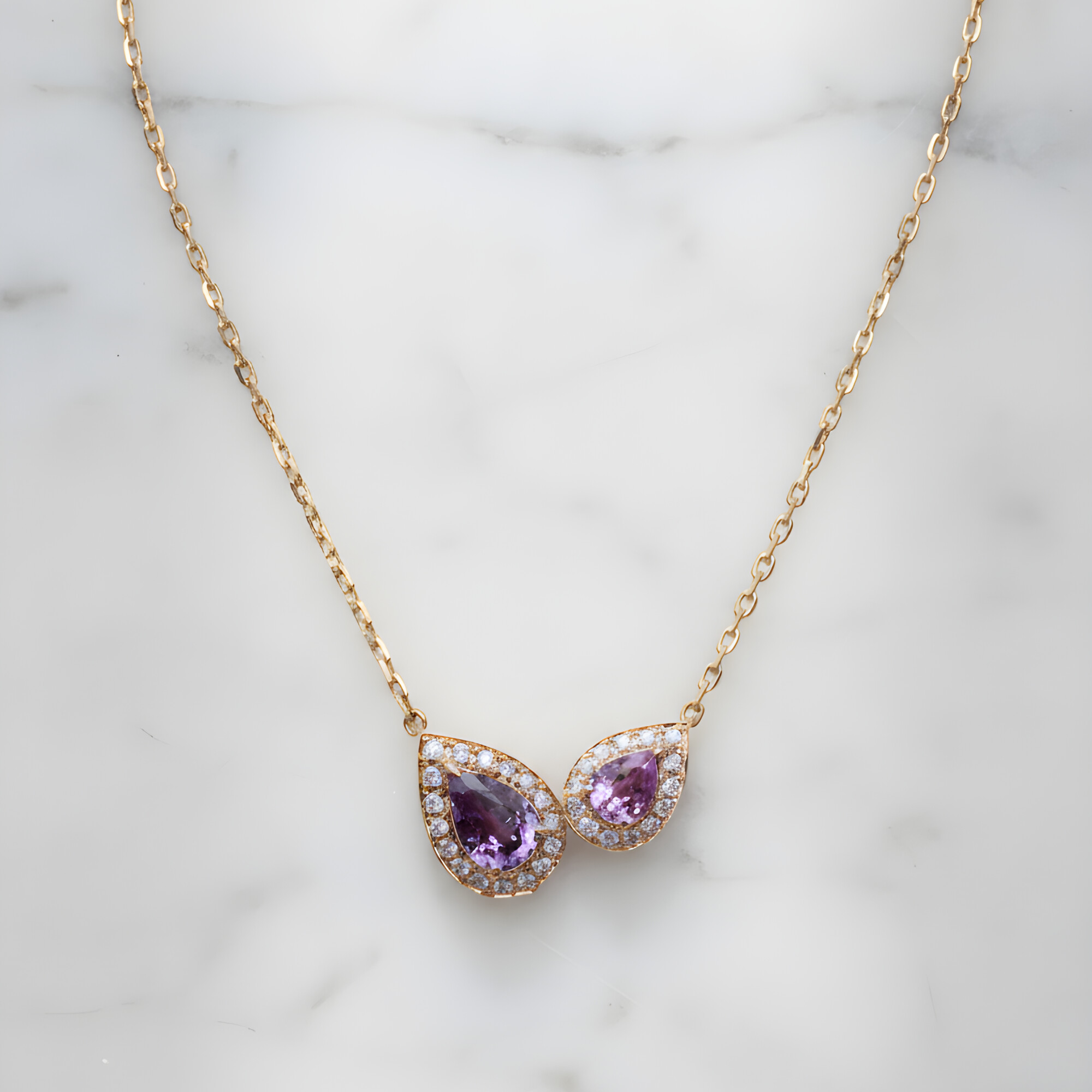 Ce collier en or rose se distingue par une composition délicate et équilibrée : deux saphirs taille poire, l’un rose, l’autre violet, dialoguent subtilement dans un jeu de couleurs harmonieux. Leurs nuances complémentaires apportent profondeur et douceur, tandis que l’or rose réchauffe l’ensemble avec élégance.