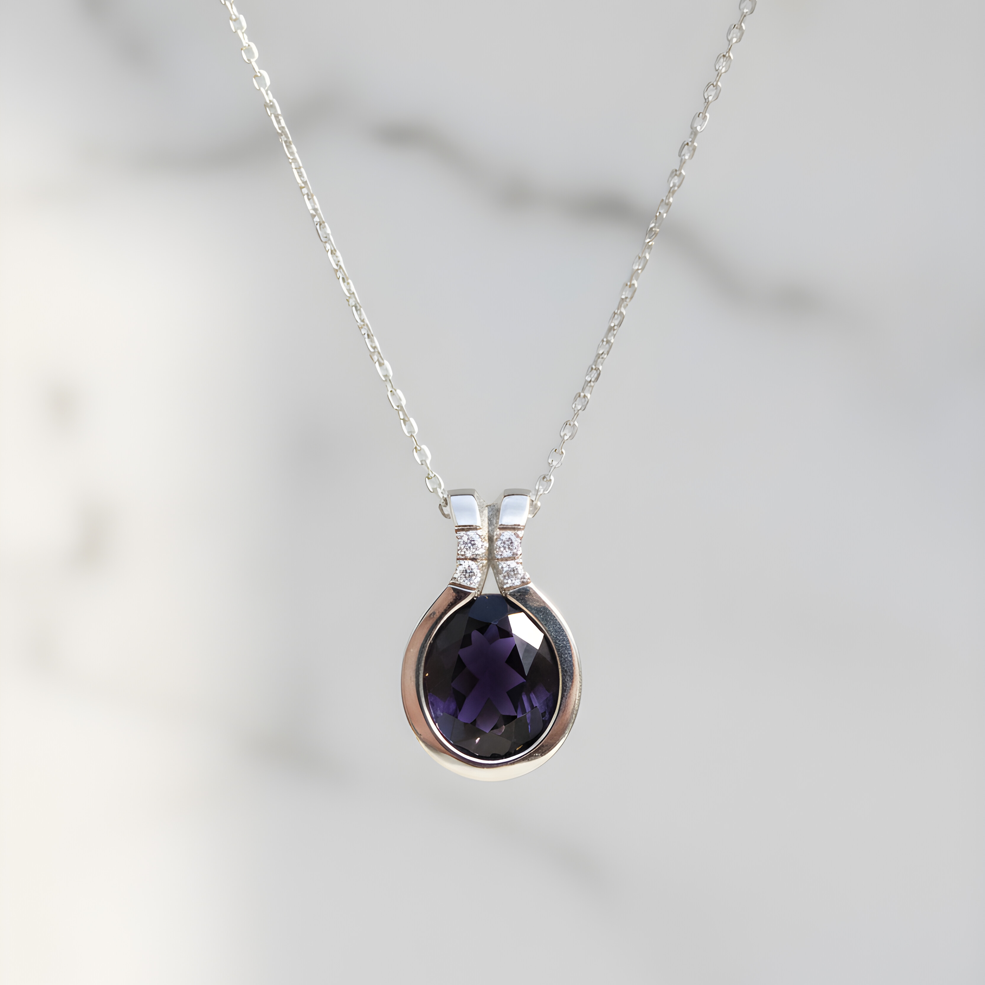 Le pendentif, réalisé en or blanc 18 carats, est rehaussé de diamants délicatement sertis au niveau de la bélière. Ce détail apporte une touche de brillance subtile et crée un équilibre raffiné entre la profondeur de l’iolite et l’éclat des diamants. La chaîne fine complète l’ensemble avec légèreté et sobriété.