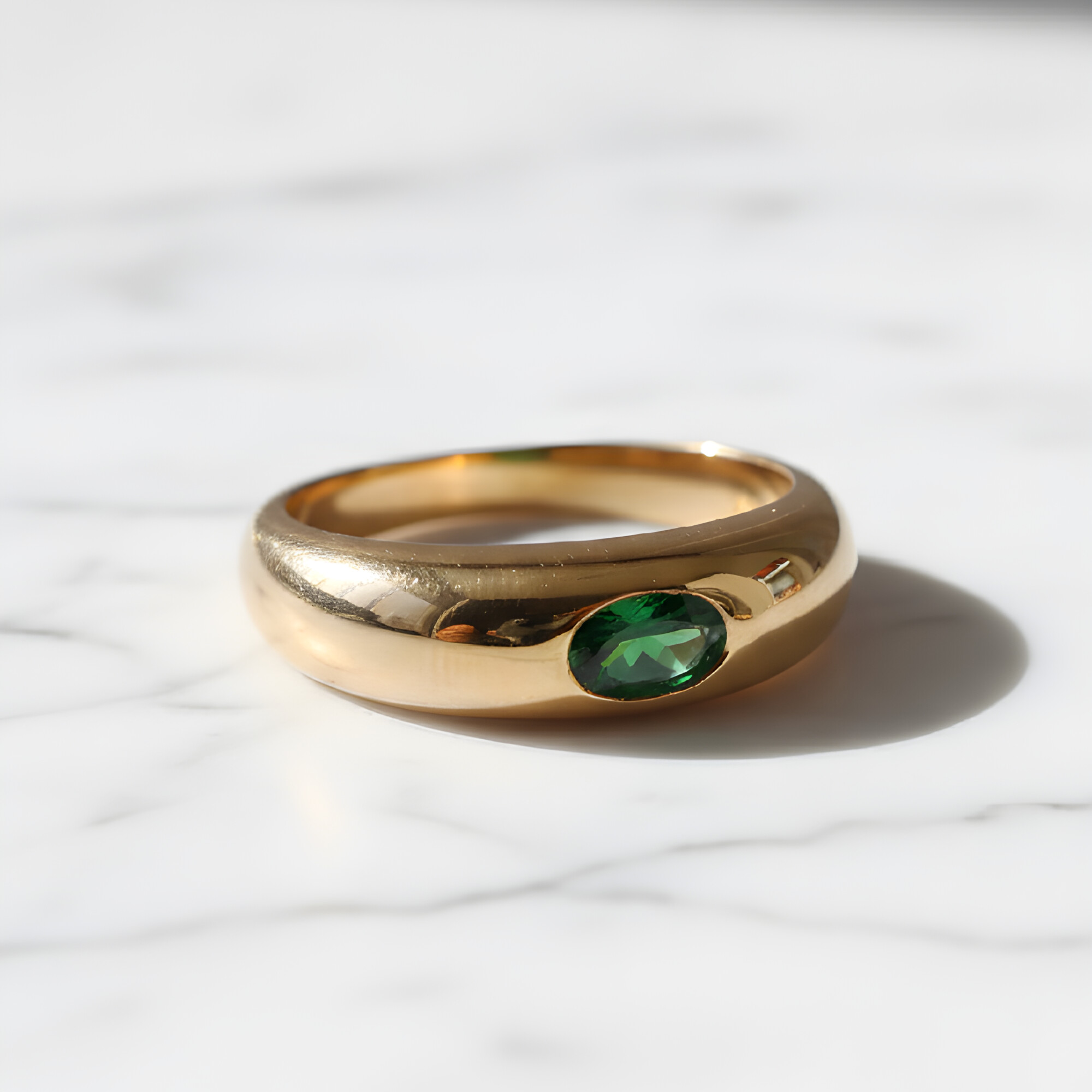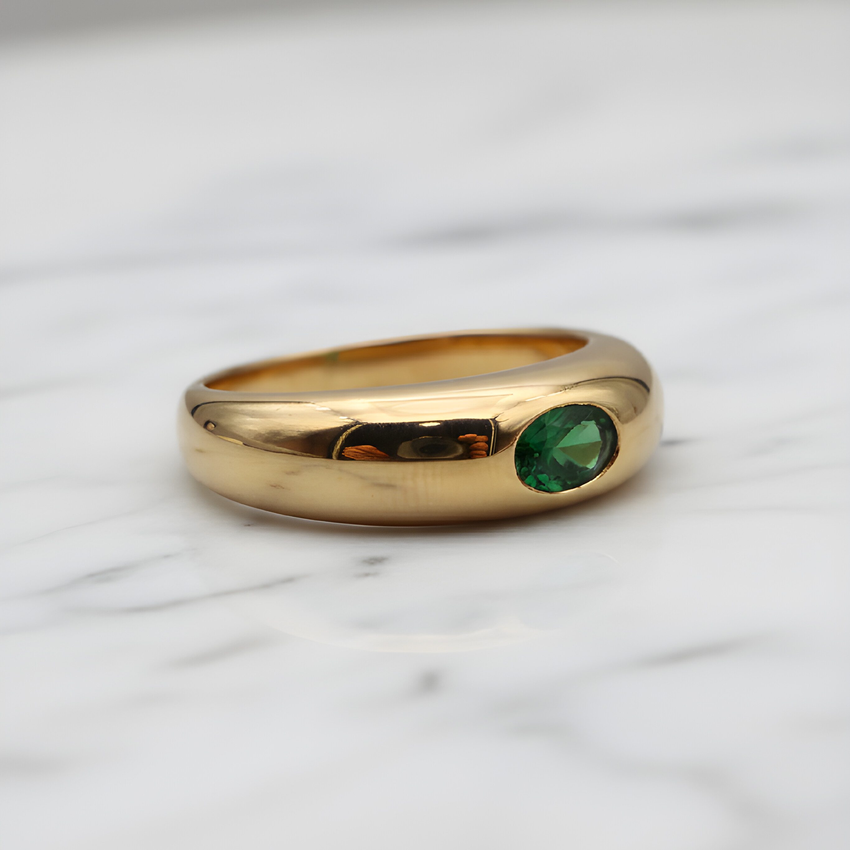 Minimaliste en apparence, spectaculaire dans le détail : ce jonc en or jaune joue la carte des volumes doux et d’une brillance miroir, pour un rendu à la fois moderne et intemporel. Sa ligne épurée est ponctuée d’une tsavorite d’un vert profond, sertie de façon discrète comme une signature précieuse.