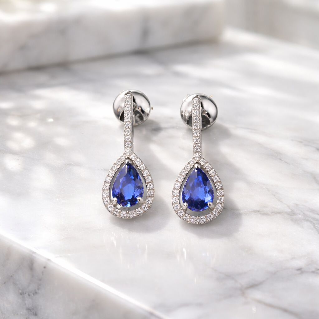 Élancées et lumineuses, ces boucles d’oreilles pendantes en or blanc subliment le visage avec une élégance naturelle. Leur design raffiné associe de magnifiques saphirs bleus taille poire, à la couleur intense et profonde, à un délicat pavage de diamants qui souligne la silhouette goutte et prolonge la ligne avec une tige brillante.
